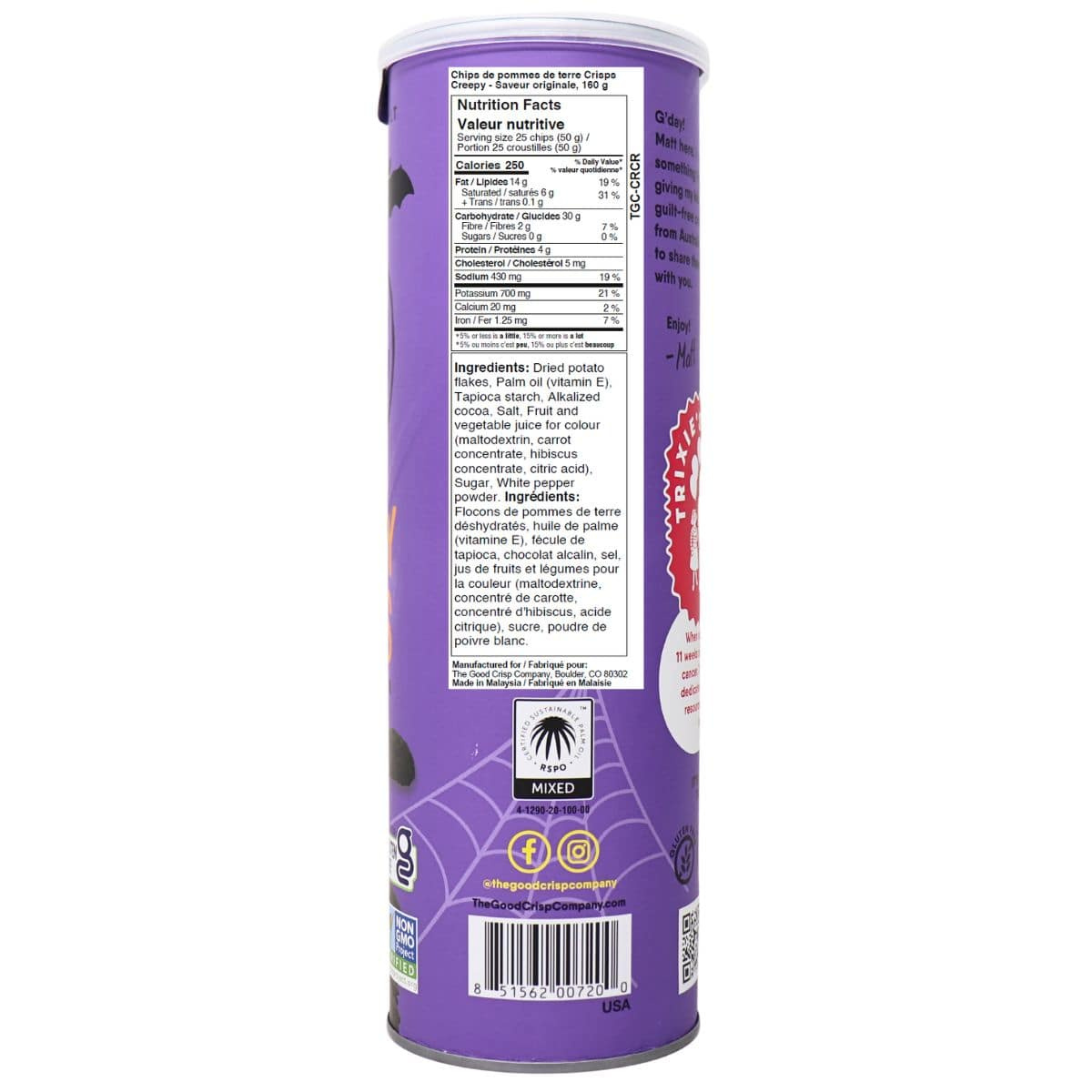 Snack your way through the spookiest season with The Good Crisp Company's Limited Edition Creepy Crisps! These crispy gluten-free potato chips are dressed to impress in a hauntingly bold black, thanks to the magic of natural fruit and veggie juices like carrots, hibiscus, and alkalized cocoa powder! But don’t let the spooky look fool you—these black potato chip tastes just like the best-selling, crave-worthy, classic original flavour that'll have you under its spell from the first bite. Made with better-for-you ingredients, The Good Crisps’ chips are the spooky Halloween snack you need! The only thing you’ll have to fear is it running out