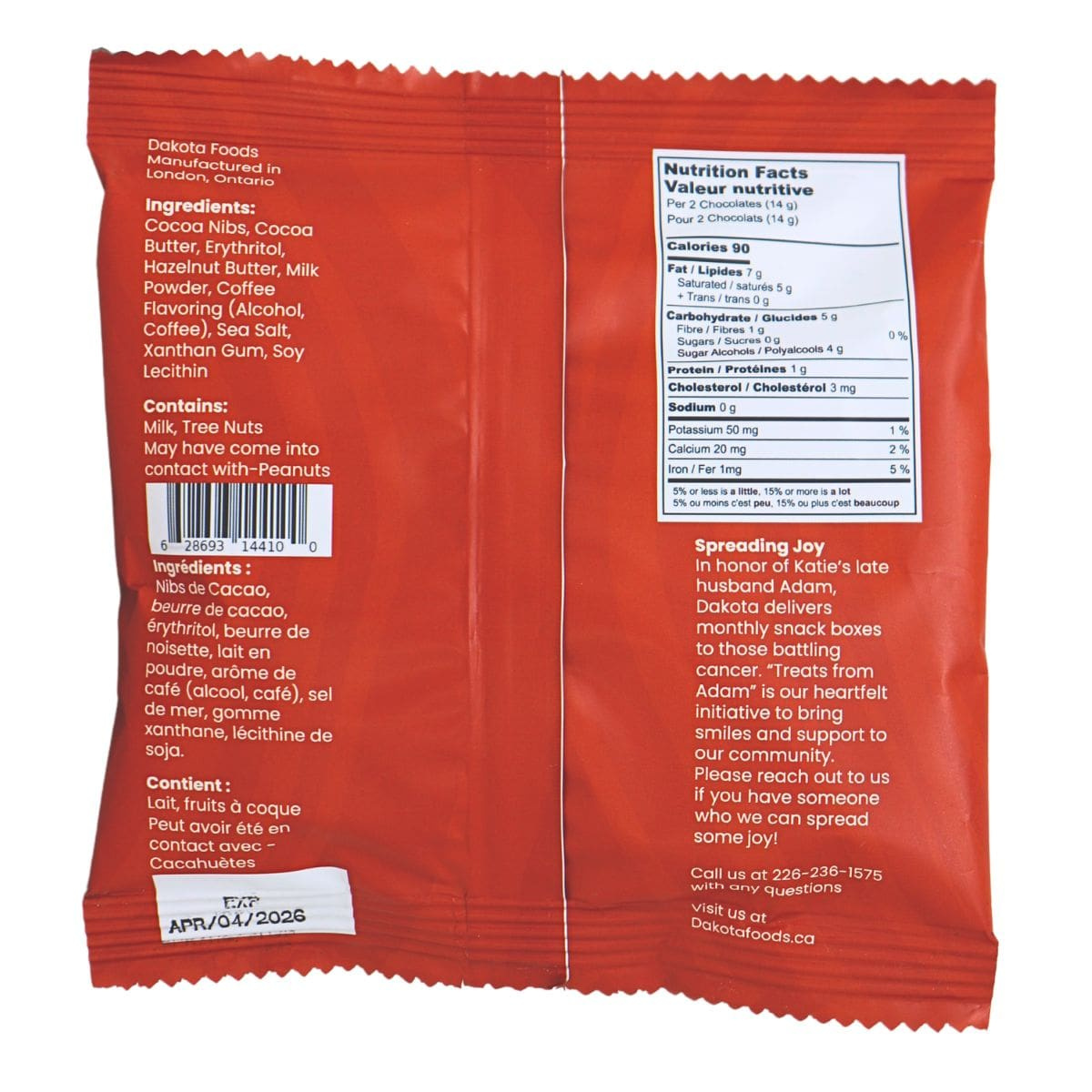 Cocoa nibs, Cocoa butter, Erythritol, Hazelnut butter, Milk powder, Coffee flavouring (alcohol, coffee), Sea salt, Xanthan gum, Soy lecithin