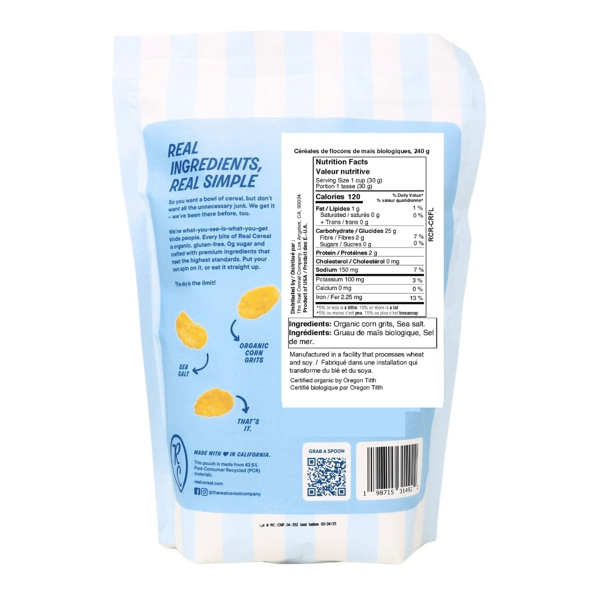 Just two ingredients? For real? Yes, really! The Real Cereal Company's Organic Corn Flakes keep it simple with just corn grits and sea salt. Nothing artificial, no added sugar and absolutely no nonsense. Just. Two. Ingredients.