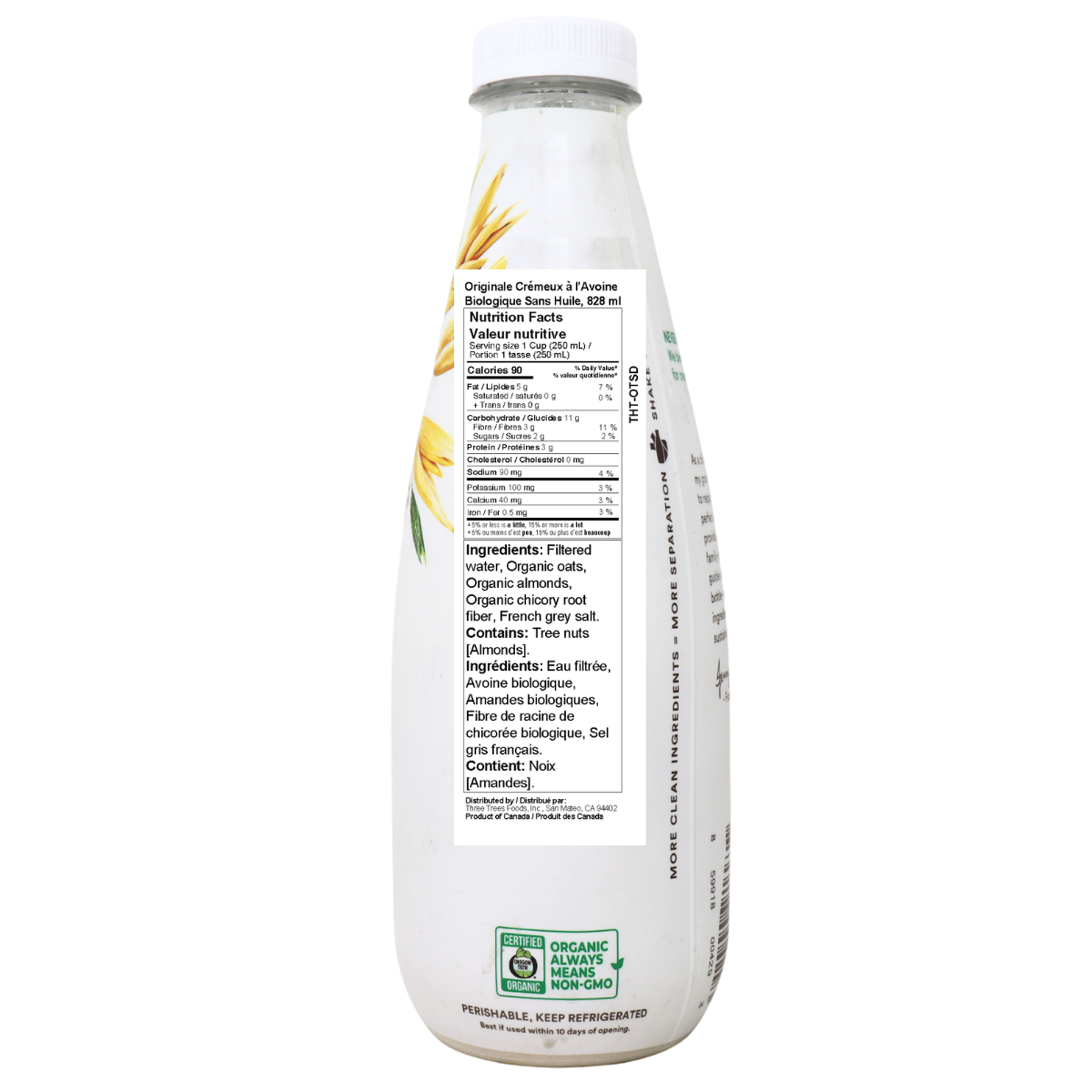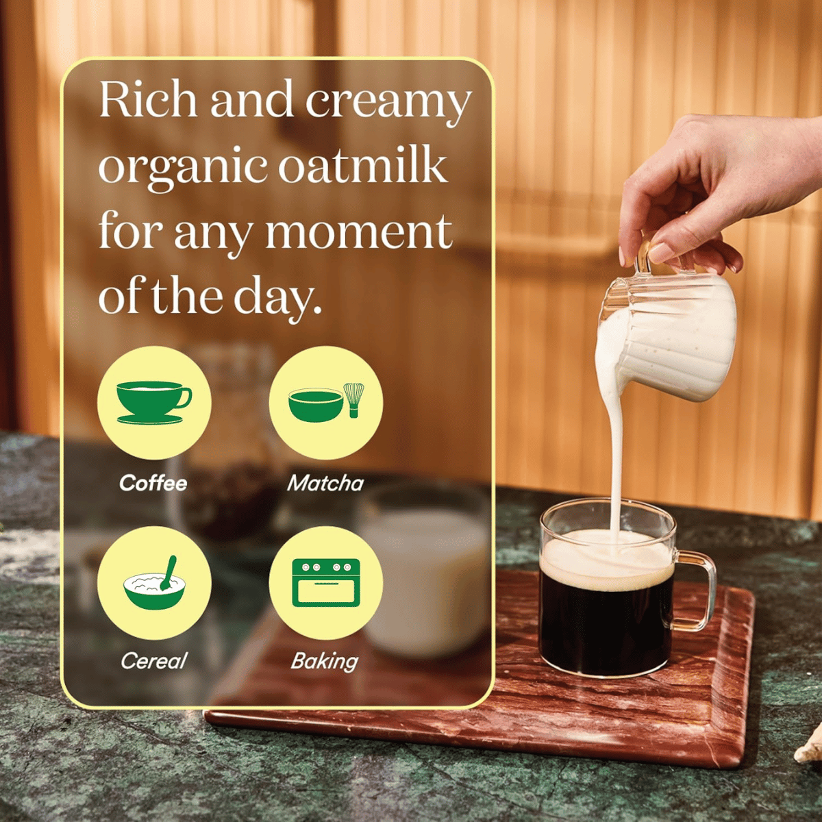 It starts with filtered water and organic oats, blended with organic almonds and a touch of organic chicory root fiber. A pinch of French grey salt rounds out this dairy-free milk alternative for a velvety oatmilk that’s rich without oils, clean without gums, and smooth without additives. It steams well for lattes, blends easily into smoothies, and adds a creamy texture to everything from chia pudding to baked oats. This oatmilk is USDA organic, glyphosate-free, and made with real ingredients you’d find in your own pantry, but without the pain of making your own oat milk (no thank you!). No preservatives. No gums. No hidden oils. Just clean, simple plant milk made for all your favourite lattes or smoothies.