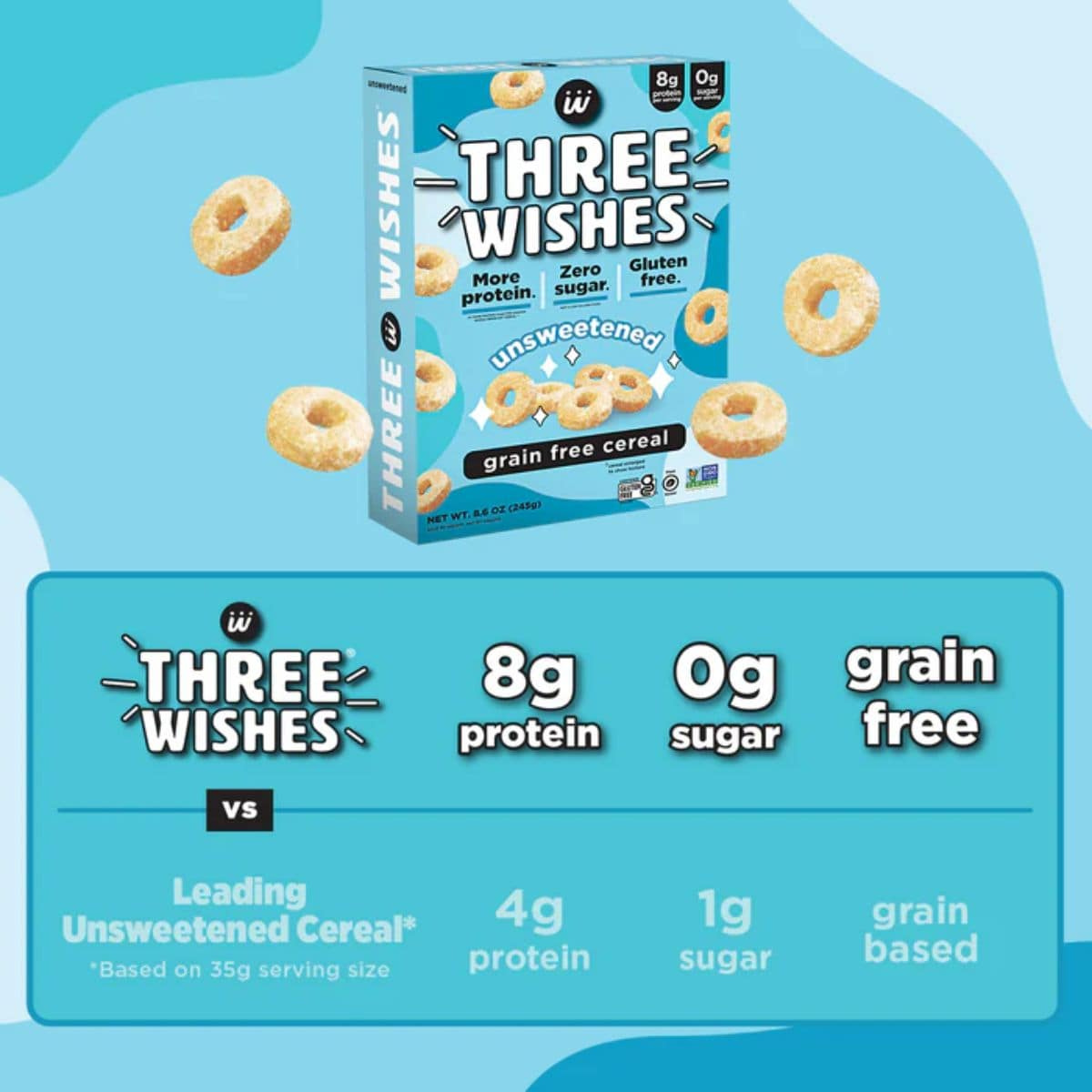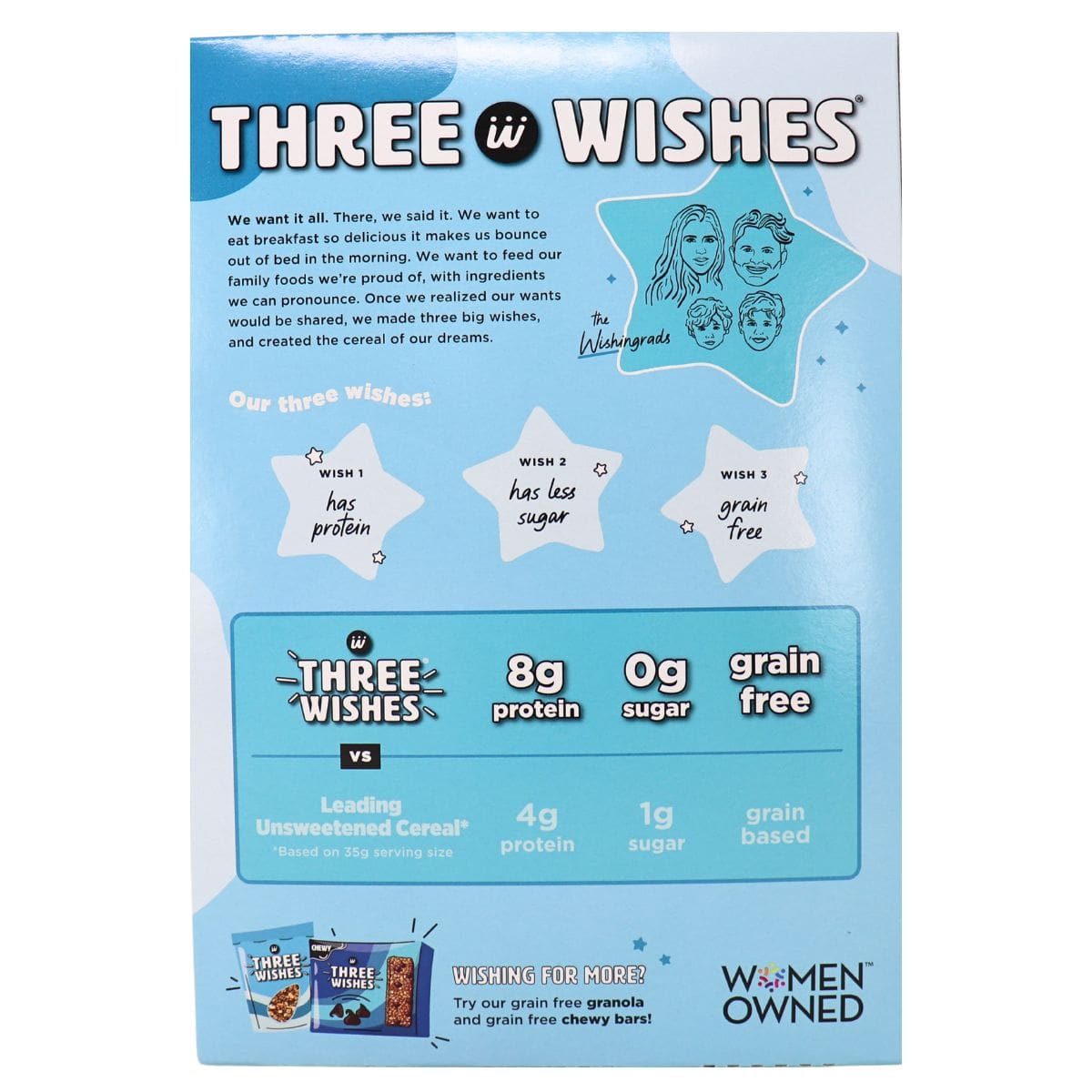 It's time to make all of your wishes come true with Three Wishes cereal! You don't want to have sugar? Done, zero sugar here! You want to skip the grains? Grain-free it is! And for your last wish, we'll make sure this gluten-free cereal is packed with plant-based protein. Now those are three wishes worth granting! Three Wishes’ unsweetened cereal truly fulfills all of your wishes. Made with only four simple ingredients that stays crunchy even after you add milk–it's almost like a genie granted your every wish for a delicious and nutritious breakfast cereal.