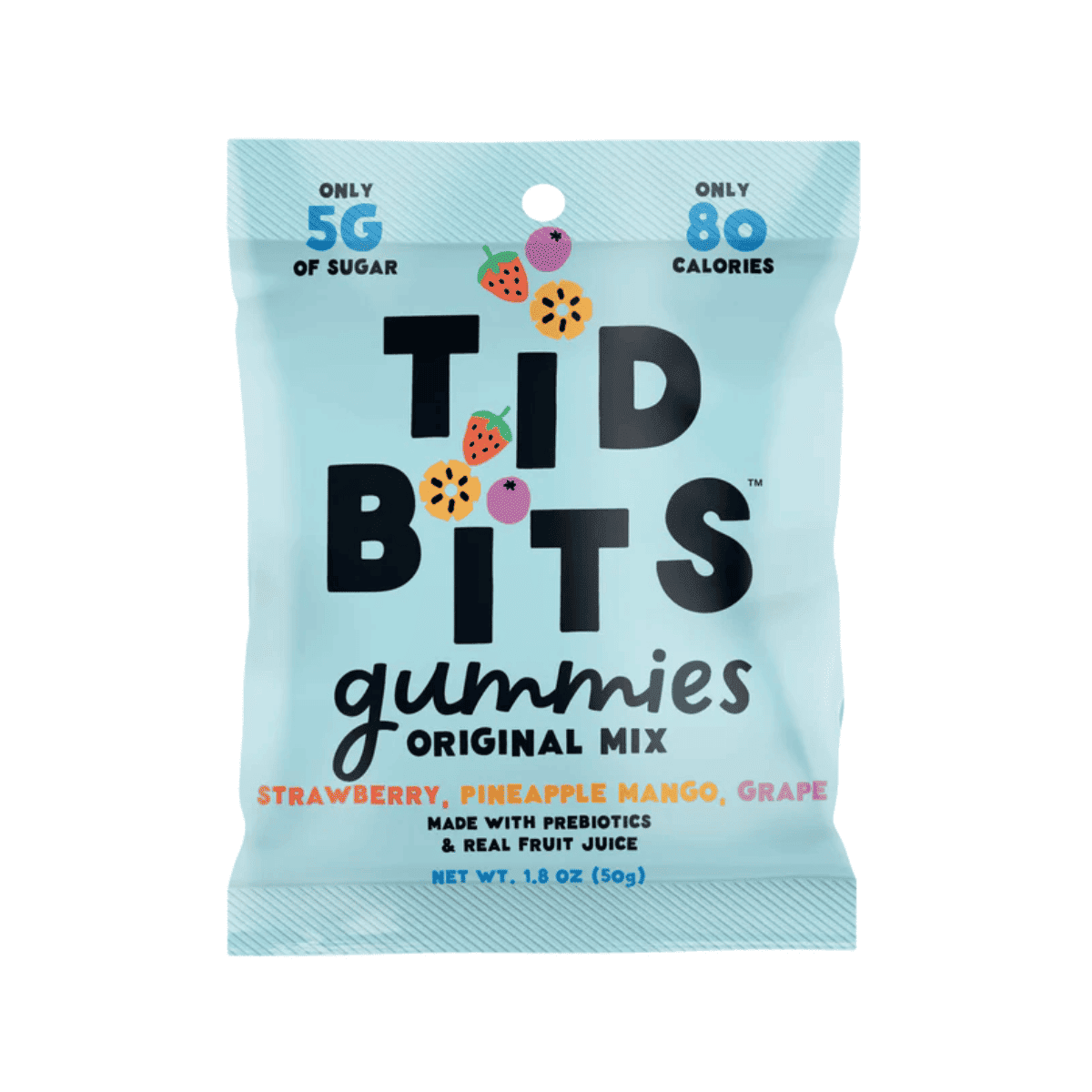 Meet the original sweet squad: TIDBITS Low Sugar Gummies Original Mix brings you a mouthwatering medley of strawberry, pineapple, mango, and grape in one brilliantly chewy bag. And the best part? This fruity quartet is low sugar candy at its finest. Just 5g of sugar, 80 calories, and zero guilt.
