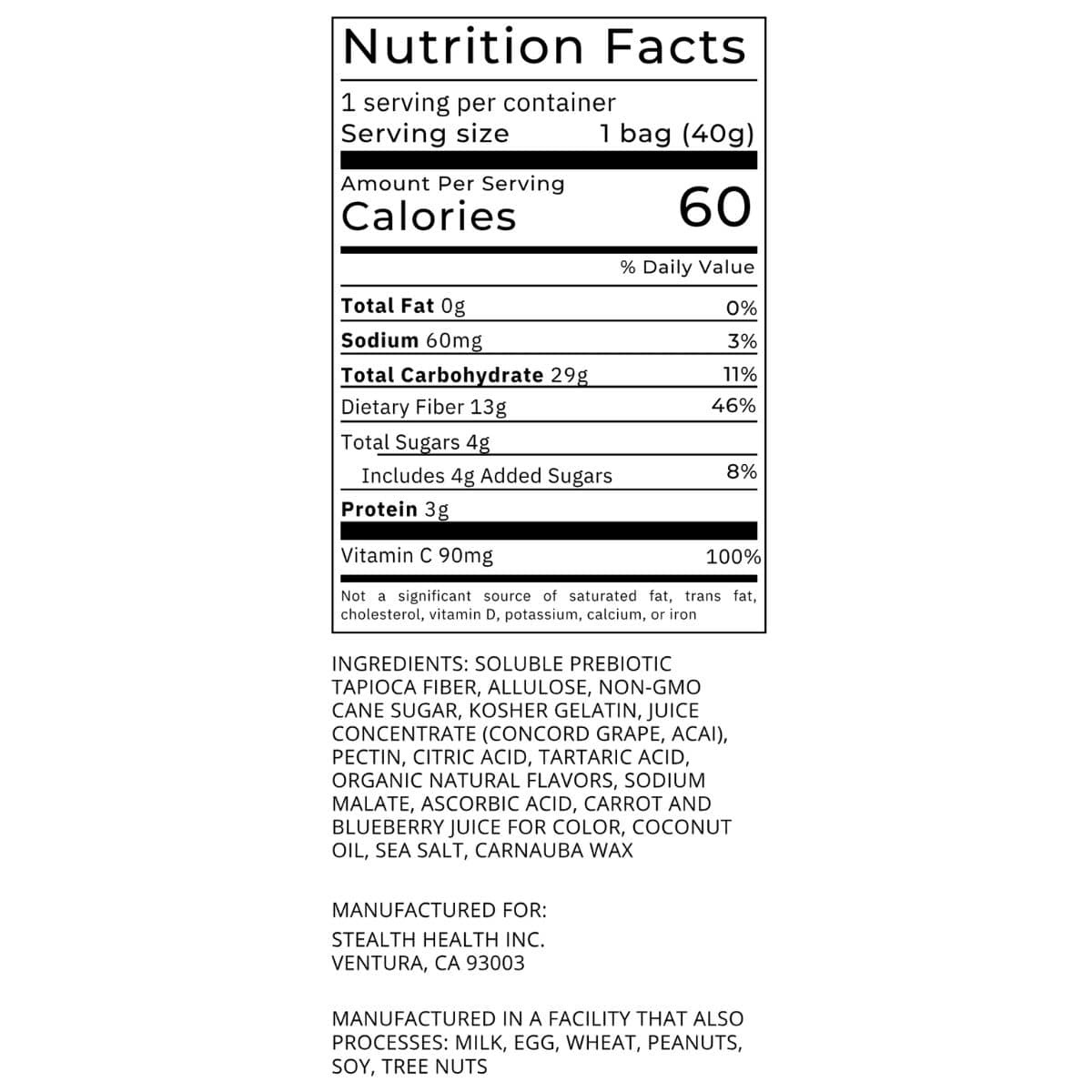 TIDBITS Low Sugar Gummies Wild Berry, 50g - Soluble prebiotic tapioca fibre, Allulose, Non-GMO cane sugar, Kosher gelatin, Juice concentrate (Strawberry, blueberry, raspberry, blackberry), Pectin, Citric acid, Tartaric acid, Organic natural flavours, Sodium malate, Ascorbic acid, Carrot and blackcurrant juice (For colour), Coconut oil, Sea salt, Carnauba wax.