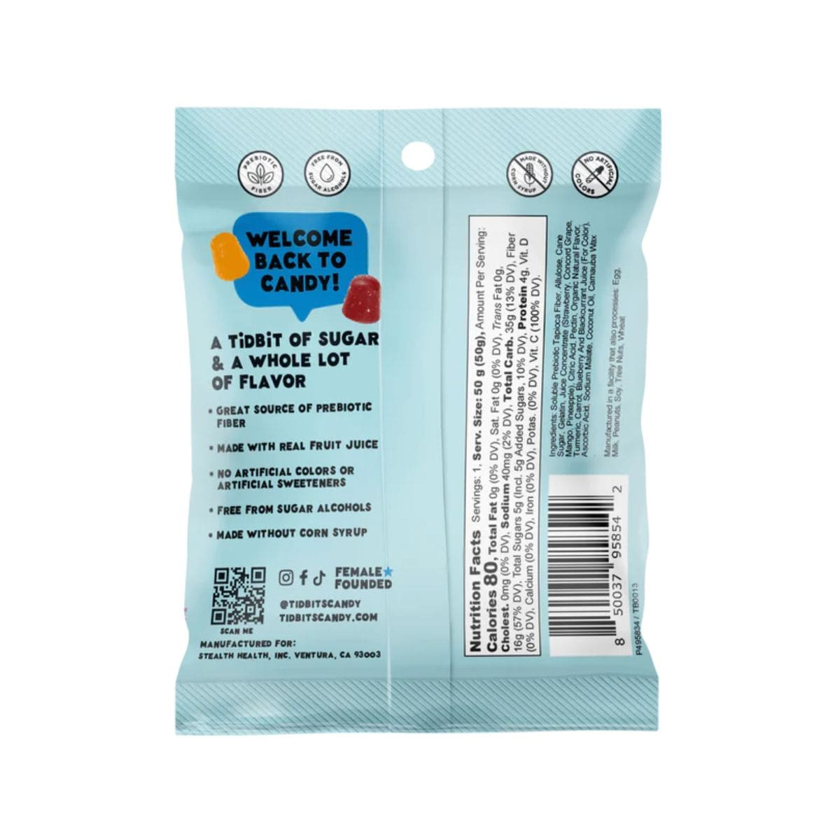 TIDBITS Low Sugar Gummies Original Mix, 50g - Soluble prebiotic tapioca fibre, Allulose, Cane sugar, Gelatin, Juice concentrate (Strawberry, concord grape, mango, pineapple), Citric acid, Pectin, Organic natural flavour, Turmeric, Carrot, Blueberry, and blackcurrant juice (For colour), Ascorbic acid, Sodium malate, Coconut oil, Carnauba wax.