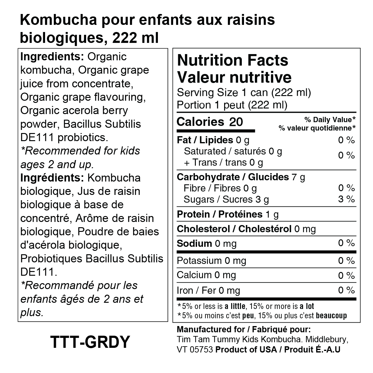 Organic kombucha, Organic grape juice from concentrate, Organic grape flavouring, Organic acerola berry powder, Bacillus Subtilis DE111 probiotics