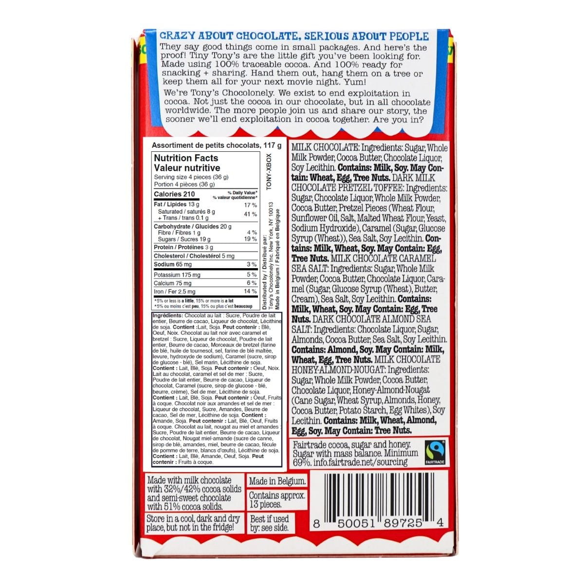 Dark Milk Chocolate Pretzel Toffee: Sugar, Chocolate Liquor, Whole Milk Powder, Cocoa Butter, Pretzel Pieces (Wheat Flour, Sunflower Oil, Salt, Malted Wheat Flour, Yeast, Sodium Hydroxide), Caramel (Sugar, Glucose Syrup - Wheat), Sea Salt, Soy Lecithin. Contains: Milk, Wheat, Soy. May Contain: Egg, Tree Nuts.