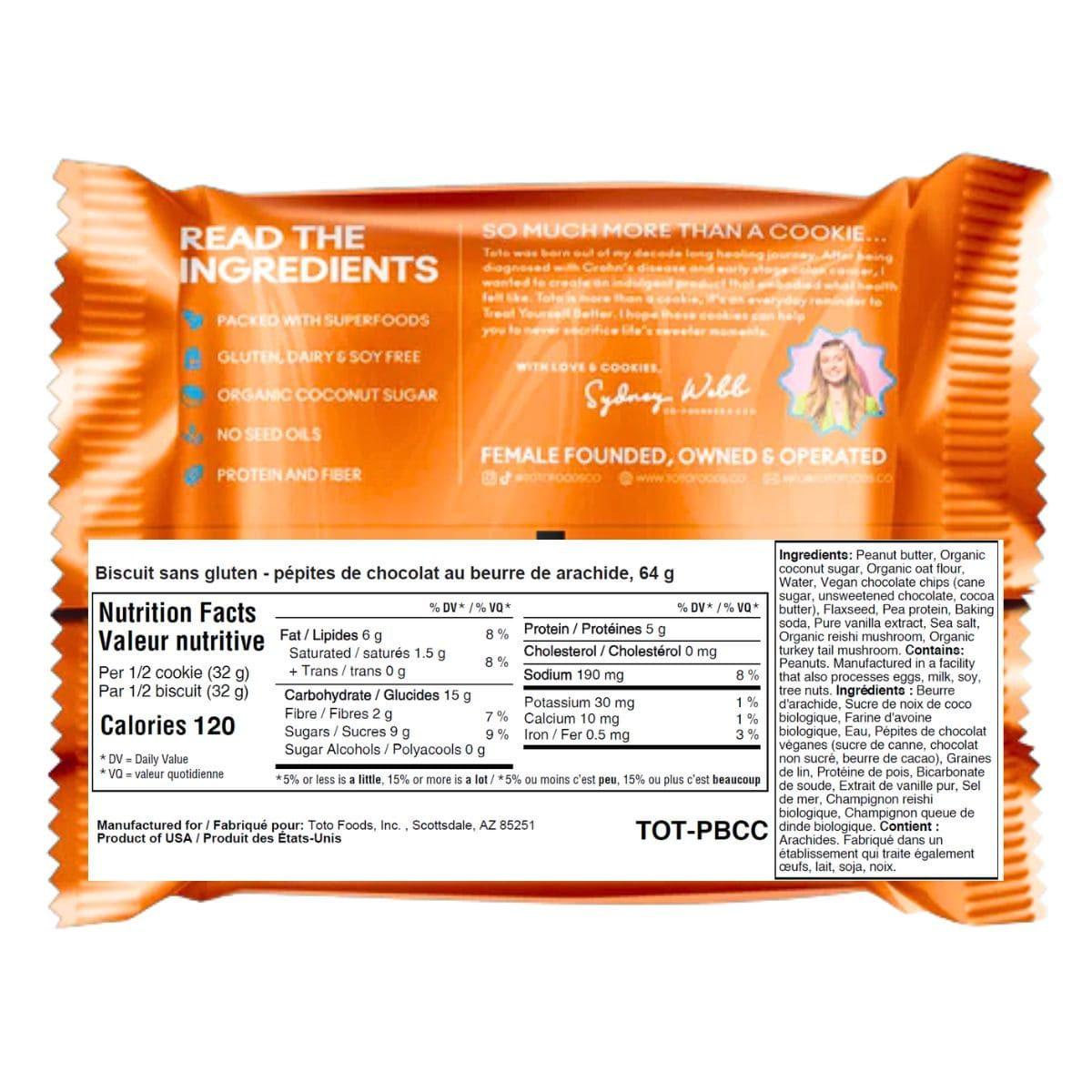 Peanut Butter, Organic Coconut Sugar, Organic Oat Flour, Water, Vegan Chocolate Chips (Cane Sugar, Unsweetened Chocolate, Cocoa Butter), Flaxseed, Pea Protein, Baking Soda, Pure Vanilla Extract, Sea Salt, Organic Reishi Mushroom, Organic Turkey Tail Mushroom