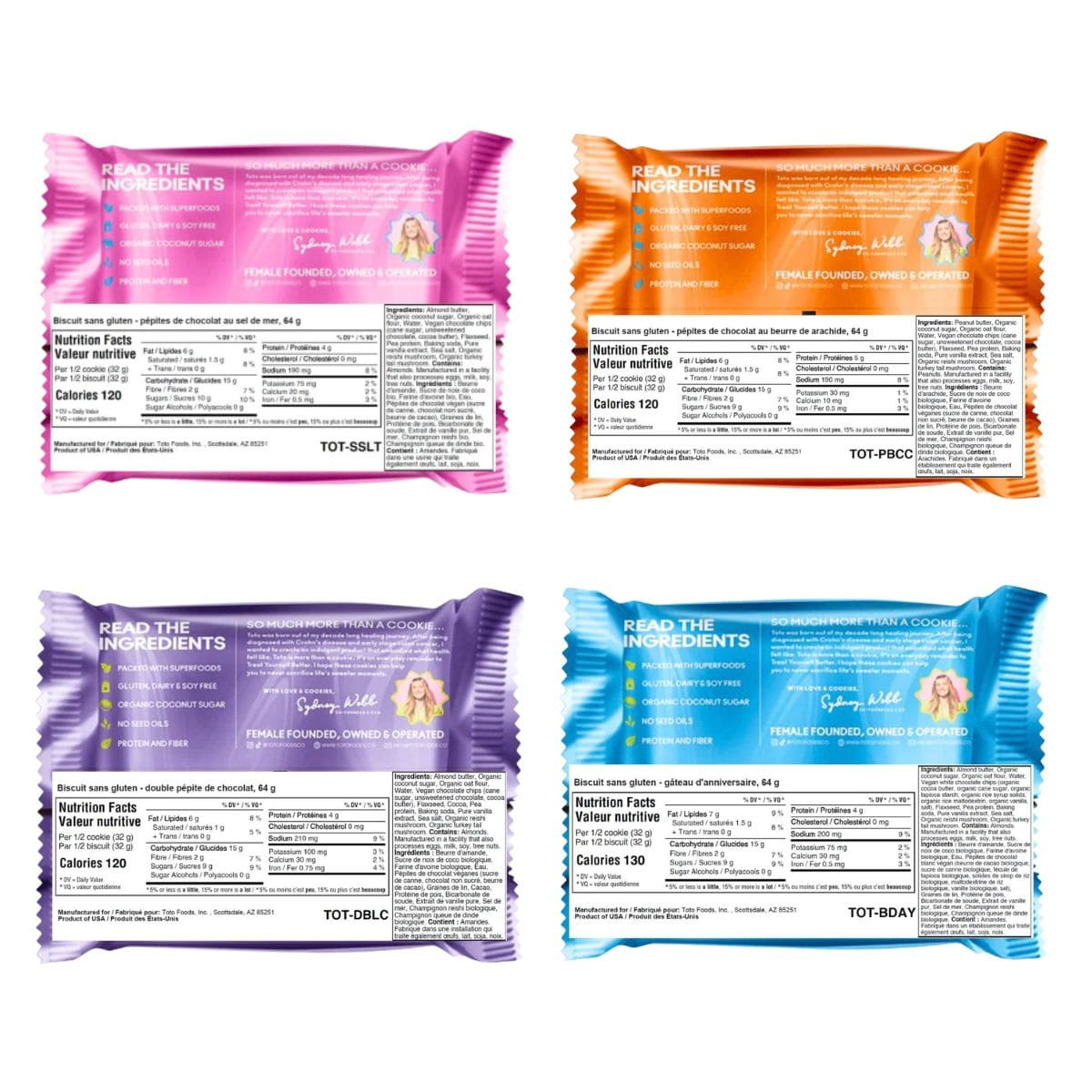 Toto Gluten-Free Protein Cookie Birthday Cake, 64g- Almond Butter, Organic Coconut Sugar, Organic Oat Flour, Water, Vegan White Chocolate Chips (Organic Cocoa Butter, Organic Cane Sugar, Organic Tapioca Starch, Organic Rice Syrup Solids, Organic Rice Maltodextrin, Organic Vanilla, Salt), Flaxseed, Pea Protein, Baking Soda, Pure Vanilla Extract, Sea Salt, Organic Reishi Mushroom, Organic Turkey Tail Mushroom Contains: Almonds Manufactured in a facility that also processes eggs, milk, soy, tree nuts.