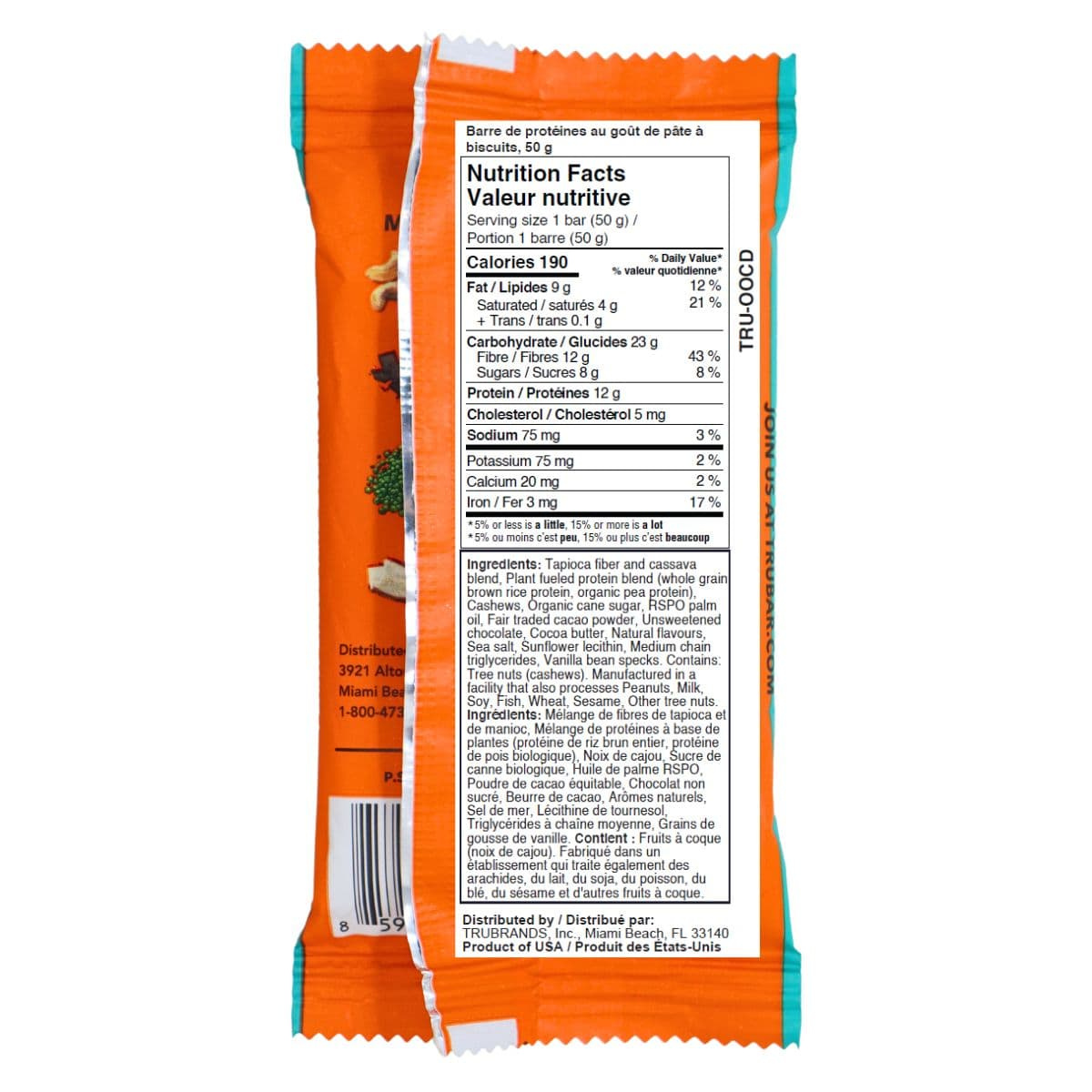 Tapioca fiber and cassava blend, Plant fueled protein blend (whole grain brown rice protein, organic pea protein), Cashews, Organic cane sugar, RSPO palm oil, Fair traded cacao powder, Unsweetened chocolate, Cocoa butter, Natural flavours, Sea salt, Sunflower lecithin, Medium chain triglycerides, Vanilla bean specks.