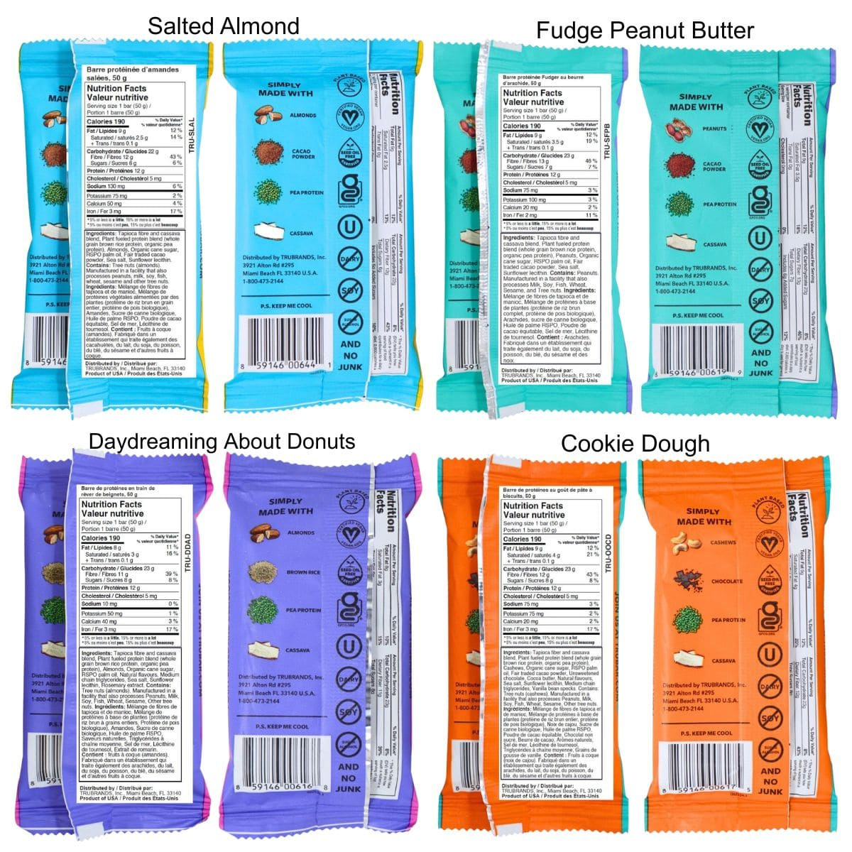 1 bar each of TRUBAR Protein Bar Oh Oh Cookie Dough, TRUBAR Protein Bar It’s Mint To Be Chip, TRUBAR Protein Bar Smother Fudger Peanut Butter, TRUBAR Protein Bar Whipped For Key Lime, TRUBAR Protein Bar Daydreaming About Donuts, TRUBAR Protein Bar Get In My Belly PB & Jelly, TRUBAR Protein Bar Strawberry Got Cake, and TRUBAR Protein Bar Saltylicious Almond Love (50 g each).