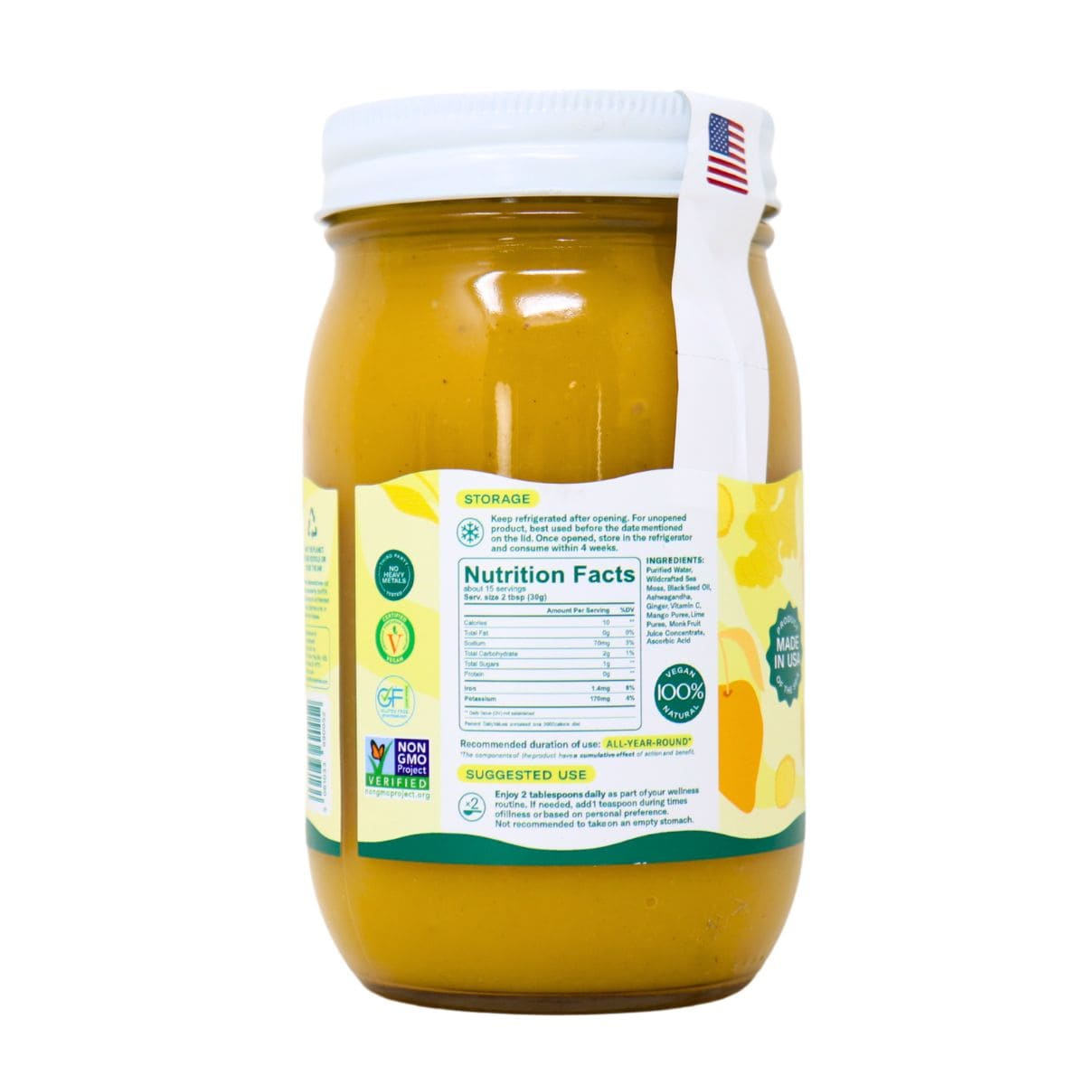 Purified water, Wildcrafted sea moss, Black seed oil, Ashwagandha, Ginger, Vitamin C, Mango puree, Lime puree, Monk fruit juice concentrate, Ascorbic acid