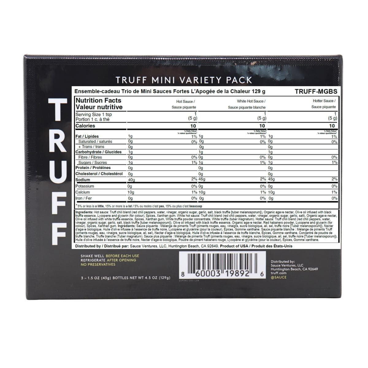 Hot Sauce: TRUFF Chili Blend (Red Chili Peppers, Water, Vinegar, Organic Sugar, Garlic, Salt, Black Truffle [Tuber Melanosporum]), Organic Agave Nectar, Olive Oil Infused With Black Truffle Essence, Lycopene and Glycerin (for colour), Spices, Xanthan Gum.