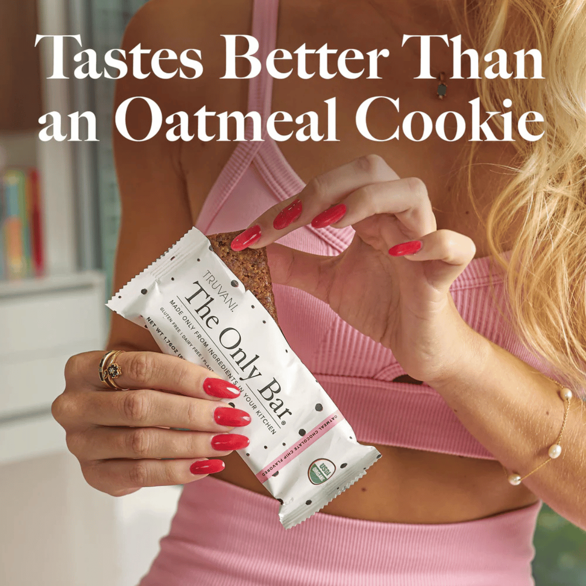 Whether you’re looking for a wholesome snack between meals, a tasty post-workout treat, or a convenient on-the-go option, Truvani The Only Bar Oatmeal Chocolate Chip Cookie is ready to crush all your cookie cravings. Get ready to indulge in your dessert cravings while fueling your body with real food you can feel good about.