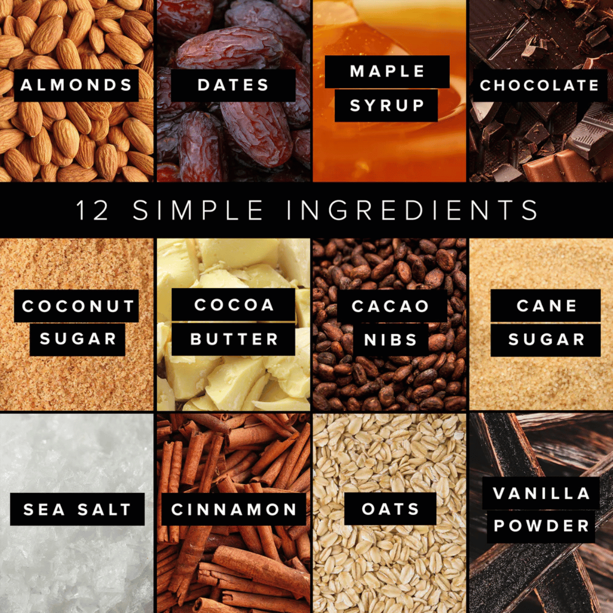 Organic almonds, Organic dates, Organic maple syrup, Organic semi-sweet chocolate (Organic coconut sugar, Organic chocolate, Organic cocoa butter), Organic oats, Organic cacao nibs, Organic cinnamon, Sea salt, Organic bourbon vanilla powder (Organic cane sugar, Organic vanilla bean extractives).