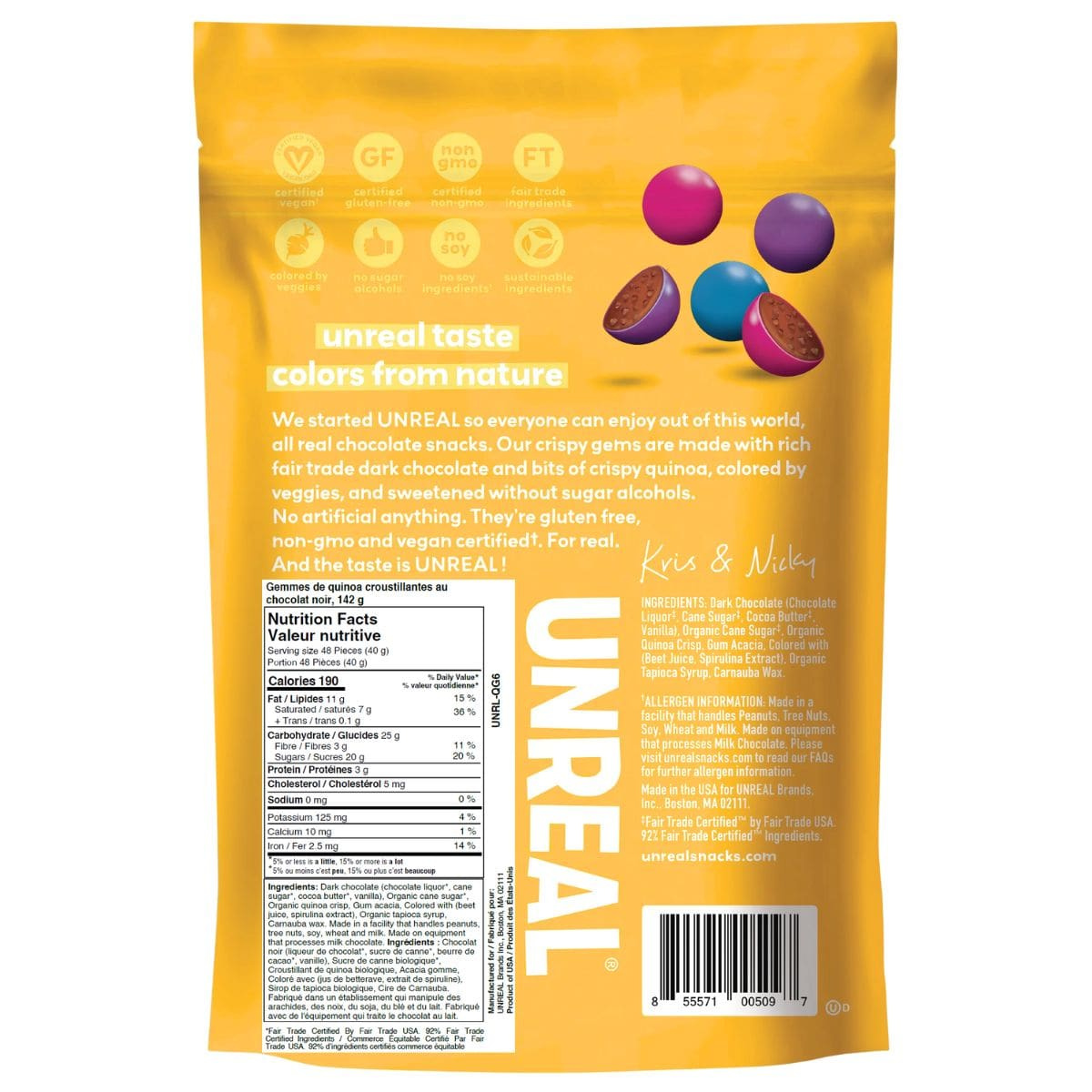 Looking for a sweet way to eat quinoa? These Unreal Dark Chocolate Crispy Quinoa Gems are the perfect combination of smooth dark chocolate and toasted quinoa coated in a crisp candy shell. Made from vegan dark chocolate, this dairy free gluten free chocolate is fun to eat and just the right amount of crunch to satisfy. Naturally coloured using vegetables and with no artificial ingredients or flavouring, this is the healthy chocolate you’ve been looking for.
