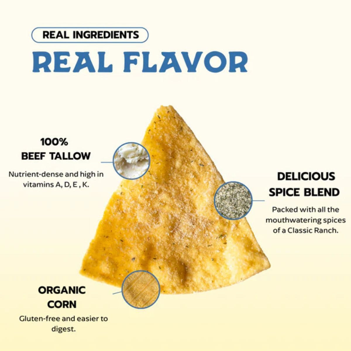 Made with organic corn and fried in beef tallow, each chip is seasoned with a classic ranch blend of onion, garlic, herbs, and dairy for a bold tallow fried ranch tortilla chip. Beef tallow adds that depth and richness that carries the ranch seasoning through every handful, making them an easy pick for gatherings, game days, or snack breaks that call for something just a little more substantial. Â These tortilla chips are built for salsa, guacamole, queso, and fully loaded nachos, with a hearty cut that stands up to dips without falling apart.Â