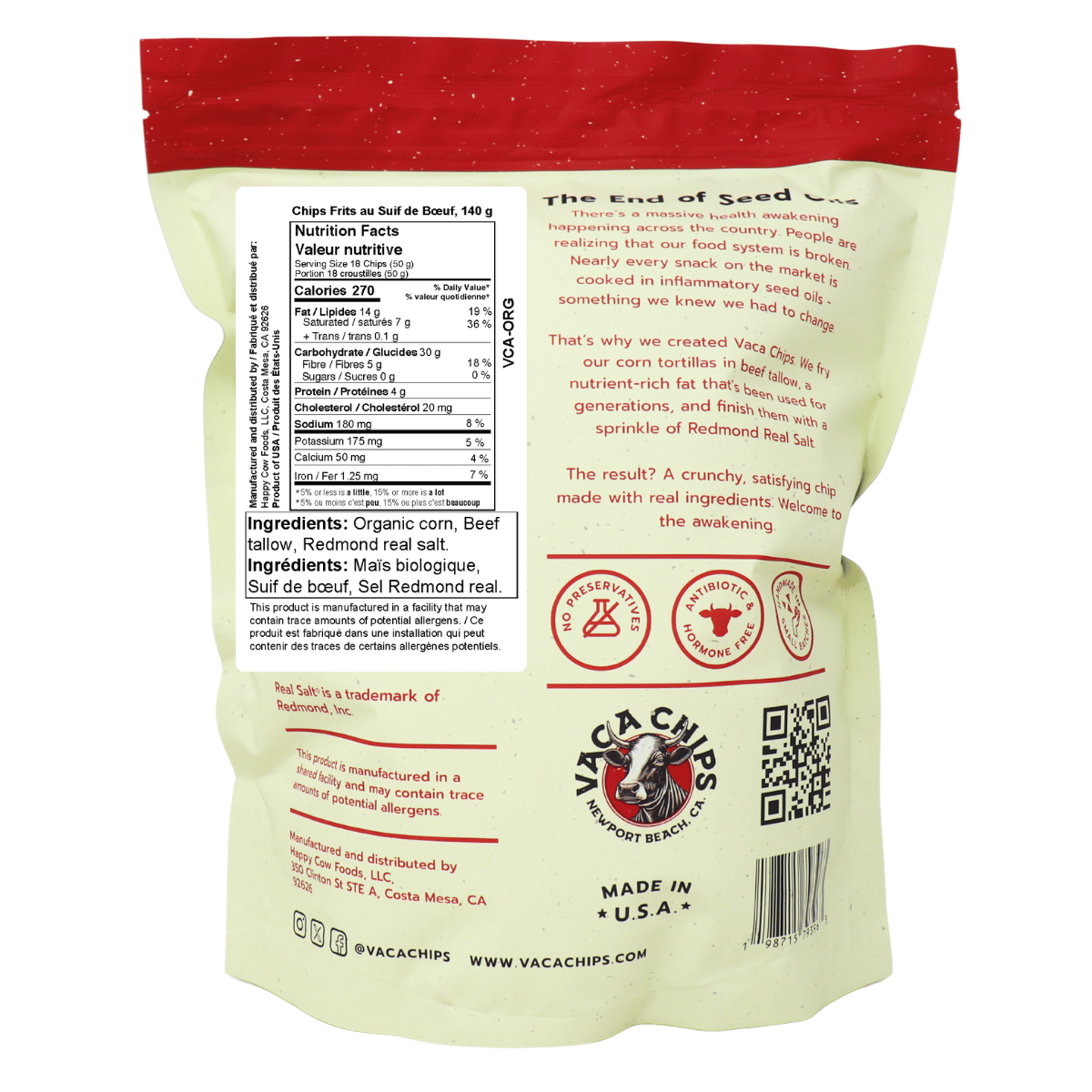 Made with just three ingredients: organic corn, beef tallow, and Redmond real salt, these chips are proof that simple recipes often taste the best. The kettle-cooked process creates a sturdier chip that is perfect for dipping in chunky guac, layering into loaded nachos, or enjoying straight out of the bag when you’re craving something salty & crunchy. Beef tallow has been used in cooking for generations, valued for the way it delivers that deep umami flavour and an unmistakable golden crunch. By returning to the basics, Vaca Chips offer a cleaner, richer snacking option without fillers or preservatives, but all the crispy tortilla chip crunch you need.