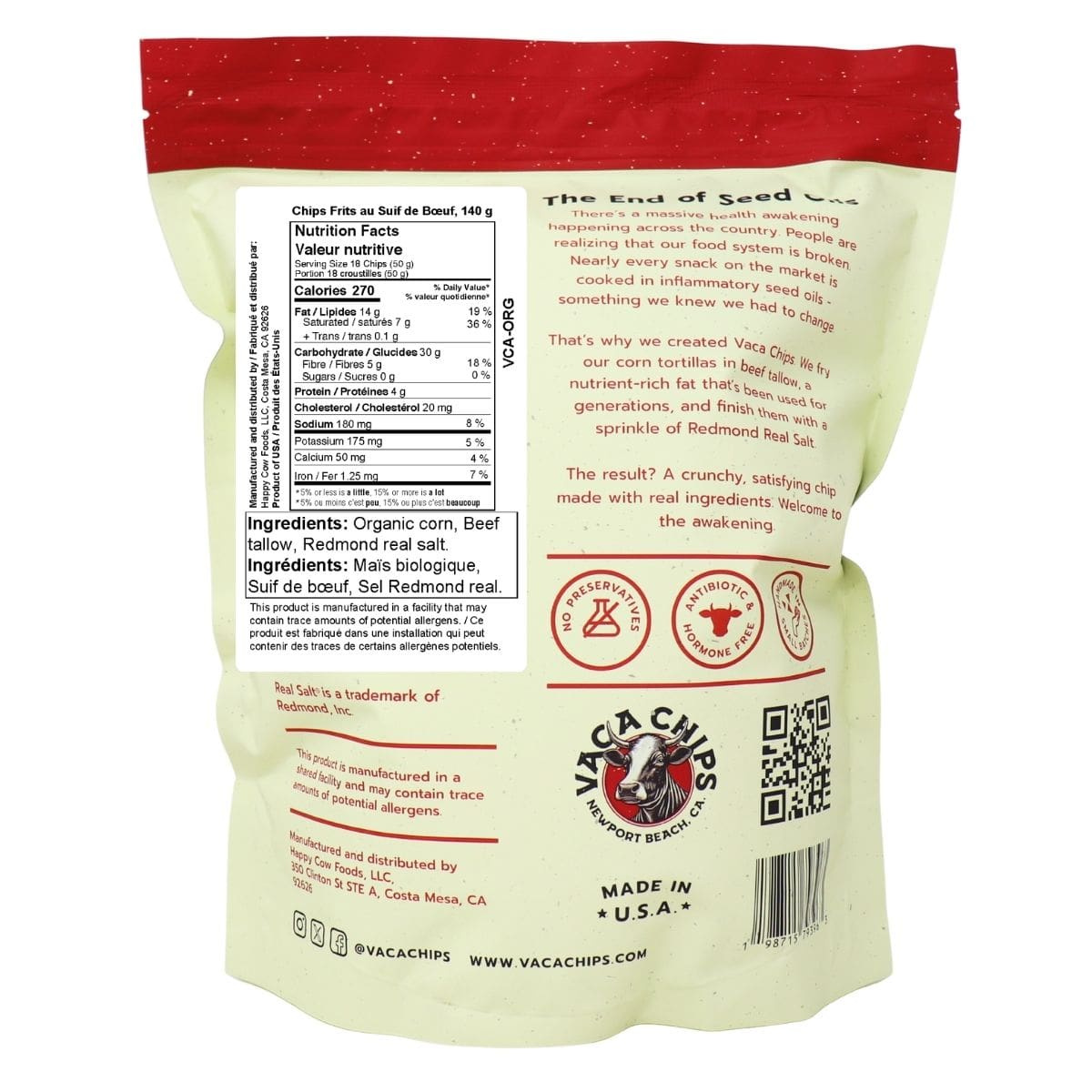 Vaca Chips Handmade Tortilla Chips made with Beef Tallow Original, 140 g - Organic corn, Beef tallow, Redmond real salt.