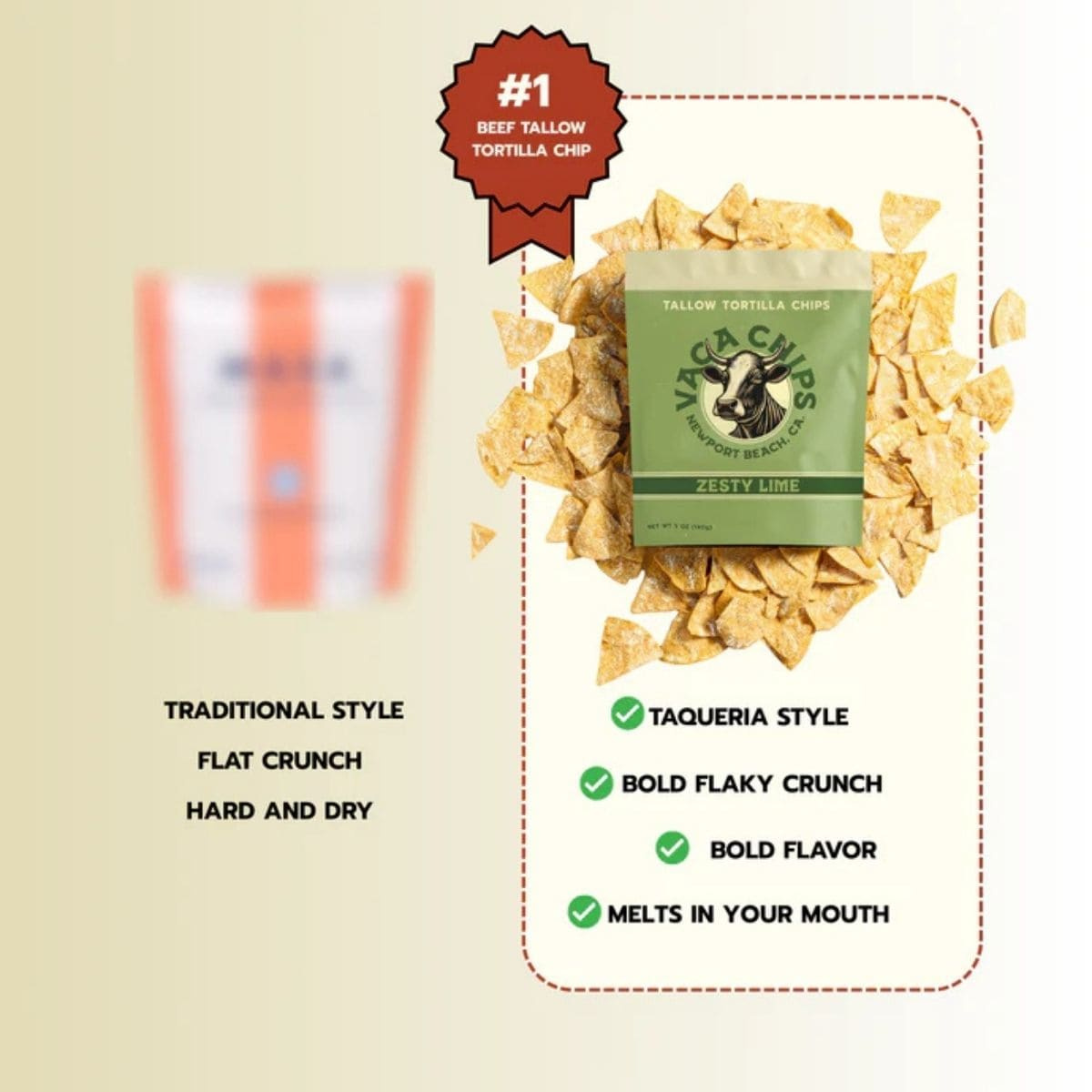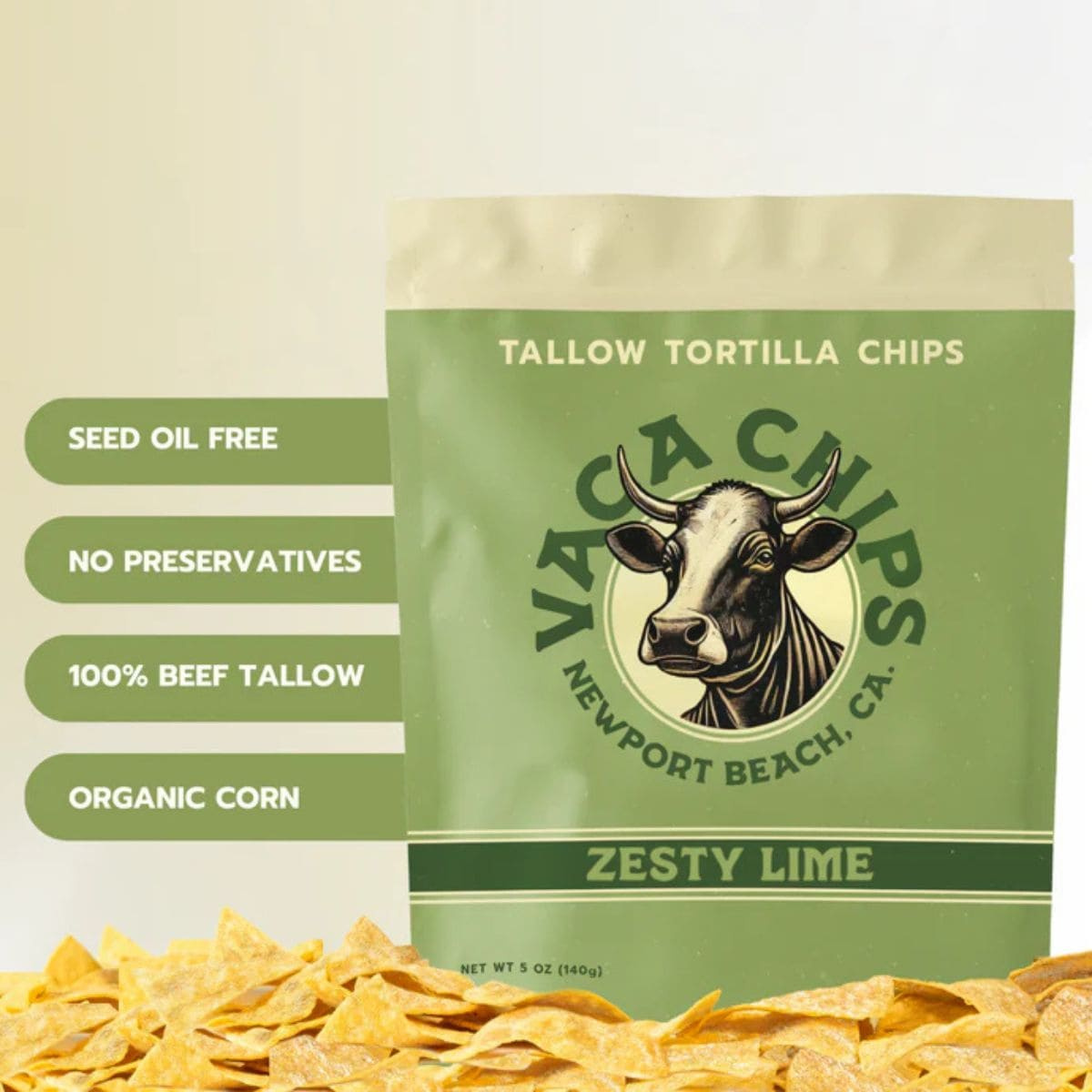 Vaca Chips Zesty Lime Tallow Tortilla Chips keep things honest and well made. Real ingredients, beef tallow frying, and bright lime seasoning come together in a tortilla chip that holds its own from the first handful to the last.