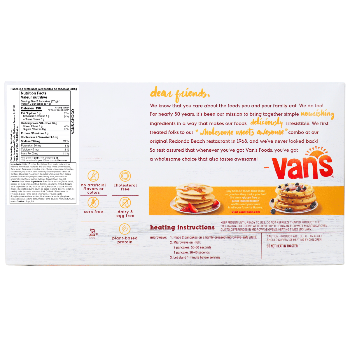 Wake up and pancake your way to great days with Van’s chocolate chip protein pancakes. These aren’t your average frozen pancakes. With 9g of plant-based protein per serving, Van's pancake are the answer to your search for a satisfying, high-protein breakfast. With a sprinkle of chocolate chips in every bite, you feel like you’re indulging, but with whole grains like oats, millet and brown rice, you get wholesome nutrition too.