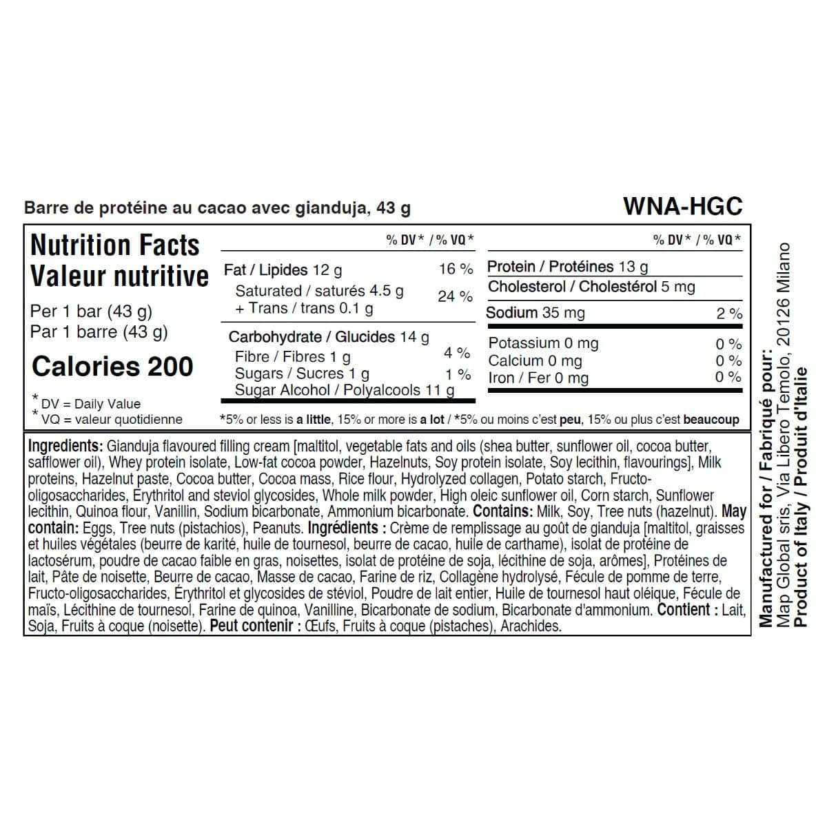 Gianduja Flavoured Filling Cream [Maltitol, Vegetable Fats And Oils (Shea Butter, Sunflower Oil, Cocoa Butter, Safflower Oil), Whey Protein Isolate, Low-Fat Cocoa Powder, Hazelnuts, Soy Protein Isolate, Soy Lecithin, Flavourings], Milk Proteins, Hazelnut Paste, Cocoa Butter, Cocoa Mass, Rice Flour, Hydrolyzed Collagen, Potato Starch, Fructo-Oligosaccharides, Erythritol And Steviol Glycosides, Whole Milk Powder, High Oleic Sunflower Oil, Corn Starch, Sunflower Lecithin, Quinoa Flour, Vanillin, Sodium Bicarbonate, Ammonium Bicarbonate