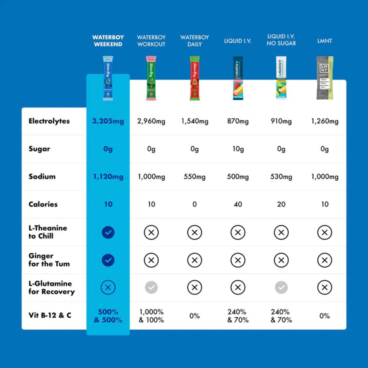Love all the flavours? Indecisive? Or just want to try them all? Waterboy Hydration + Weekend Recovery Sample Pack lets you experience every delicious flavour of their sugar-free electrolytes with 2 sticks each of Strawberry Lemonade, Blue Raspberry, Fruit Punch, Lemon Lime, Candied Grape and Lemon Ginger. Packed with 3x the electrolytes of leading competitors, these hydration powders deliver fast, effective hydration and recovery. With a potent blend of L-theanine, ginger root, and vitamins, Waterboy's Weekened Recovery is perfect for on-the-go hydration, post-workout recovery, or bouncing back from a big night out. With zero sugar and only 10 calories, tis electrolyte sample pack lets you try them all before picking your favourite! Hydrate, recover, and feel your best, with zero sugar and maximum benefit!