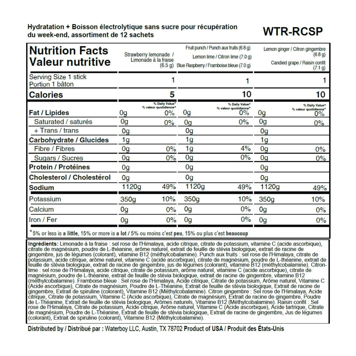 Strawberry Lemonade: Pink Himalayan Salt, Citric Acid, Potassium Citrate, Vitamin C (Ascorbic Acid), Magnesium Citrate, L-Theanine Powder, Natural Flavor, Organic Stevia Leaf Extract, Ginger Root Extract, Vegetable Juice (Color), Vitamin B12 (Methylcobalamin).