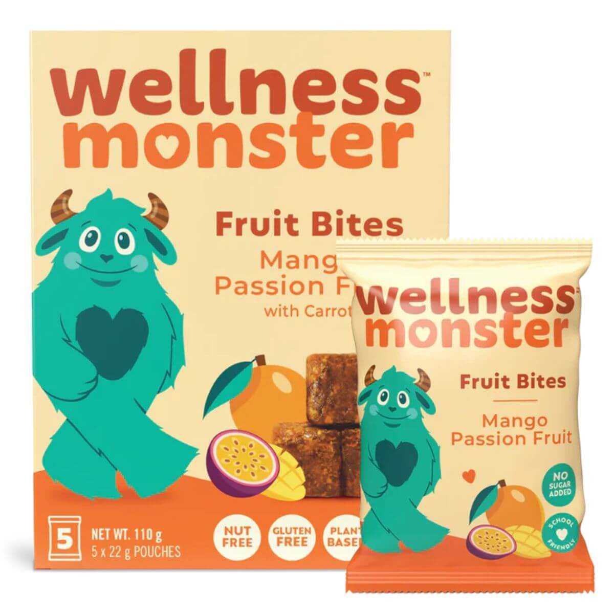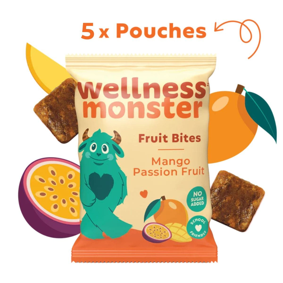Tropical flavour, chewy texture, and no added sugar makes this a fruit snack that actually works for both kids and parents. Wellness Monster Mango Passion Fruit Fruit Bites are soft and juicy with a bright tropical taste that feels like a treat. Every piece is made with real fruit purées to keep the sweetness natural and the texture just right.