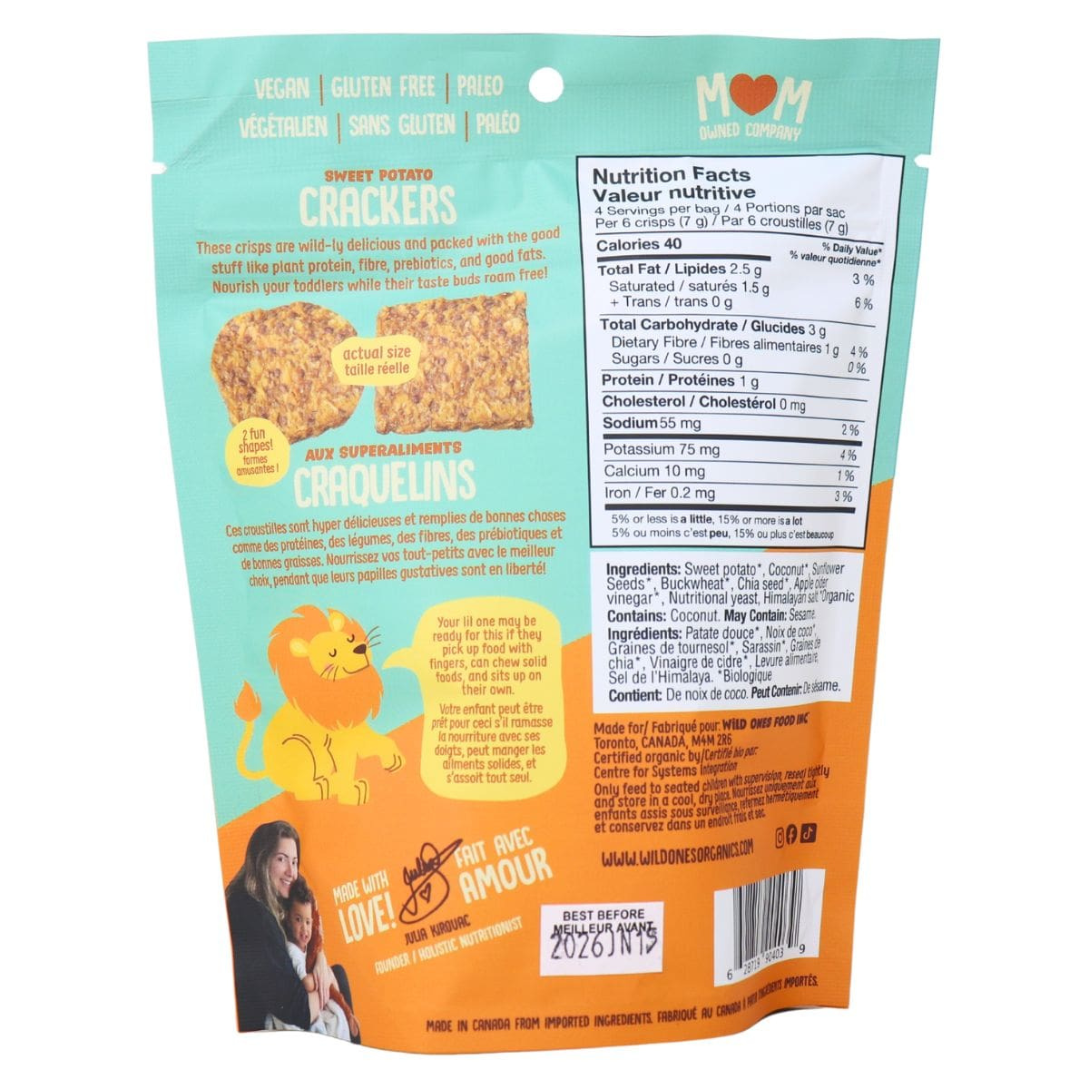 Crunchy, savoury, and made with real vegetables, Wild Ones A Lil’ Cheezy Sweet Potato Crackers bring fun and function to snack time. Each bite is made with organic sweet potato, sunflower seeds, and nutritional yeast for natural cheezy flavour that little ones love.