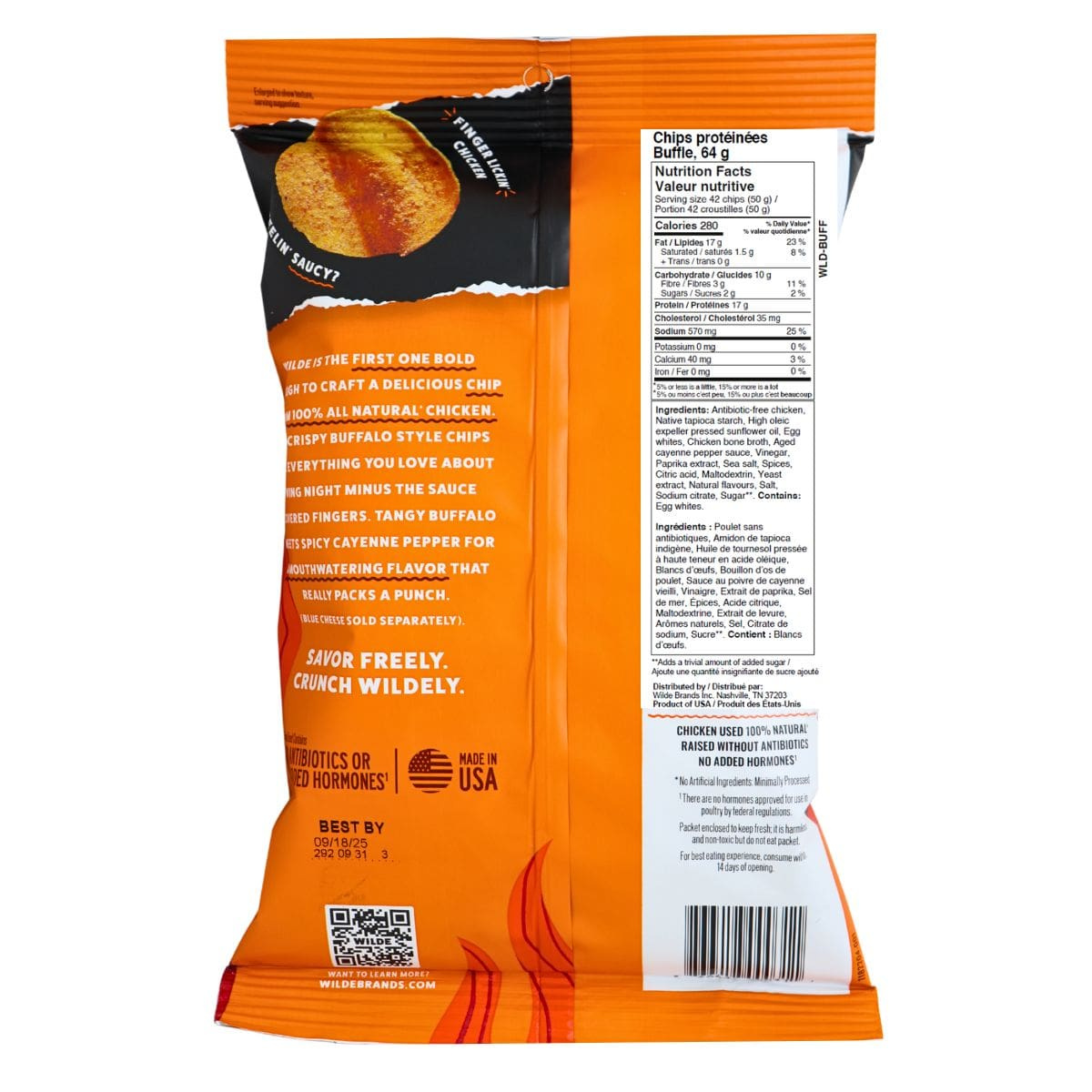 Antibiotic-free chicken, Native tapioca starch, High oleic expeller pressed sunflower oil, Egg whites, Chicken bone broth, Contains less than 2% of: Aged cayenne pepper sauce, Vinegar, Paprika extract, Sea salt, Spices, Citric acid, Maltodextrin, Yeast extract, Natural flavours, Salt, Sodium citrate, Sugar**.
