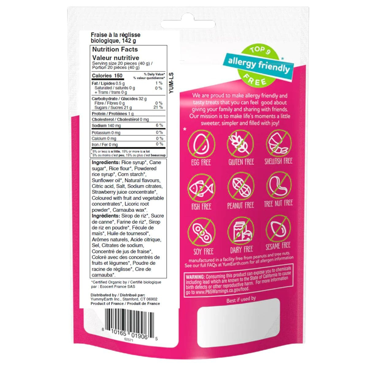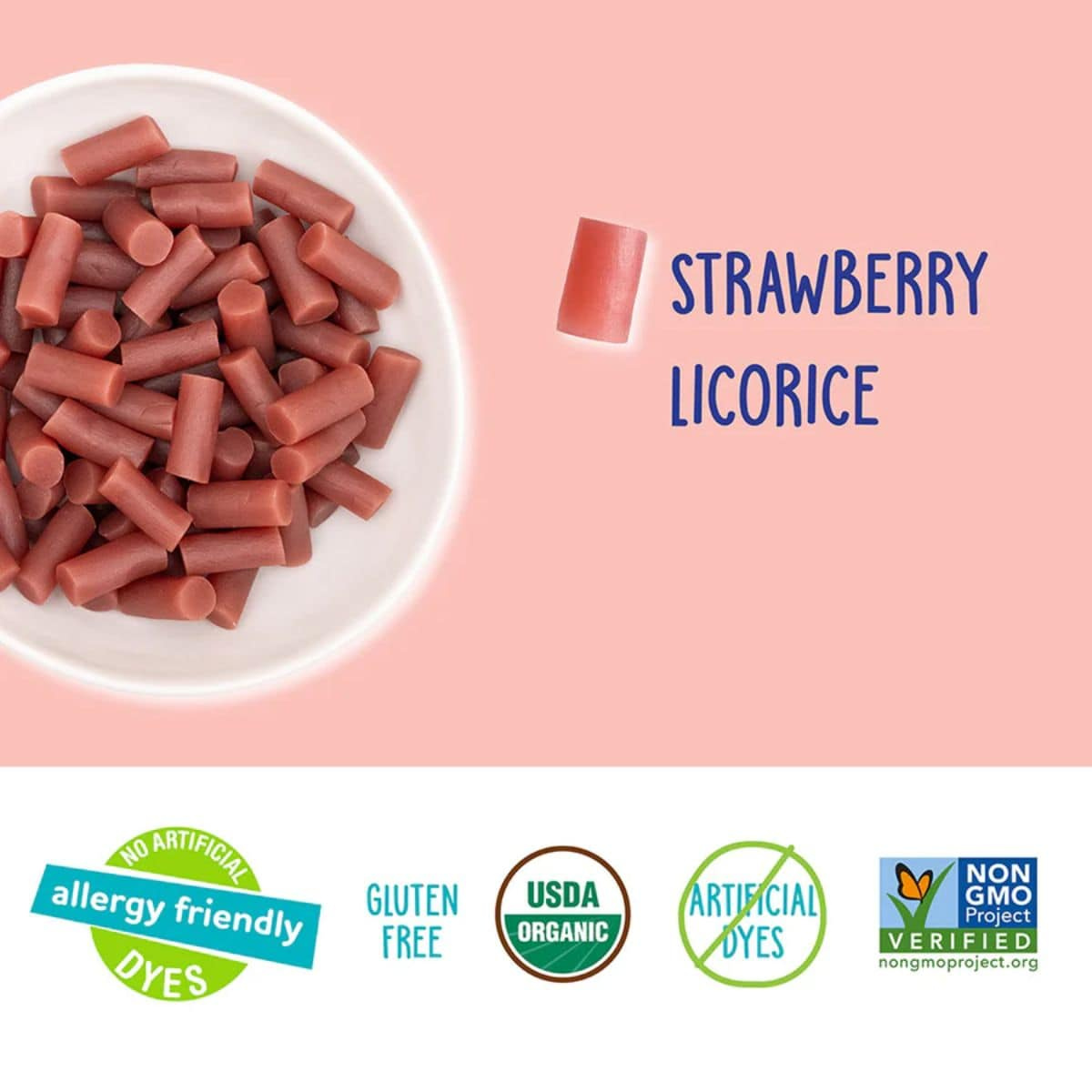 Organic rice syrup, Organic cane sugar, Organic rice flour, Organic powdered rice syrup, Organic corn starch, Organic sunflower oil, Natural flavors, Citric acid, Salt, Sodium citrates, Organic strawberry juice concentrate, Coloured with organic fruit and vegetable concentrates, Organic licoric root powder, Organic carnauba wax.