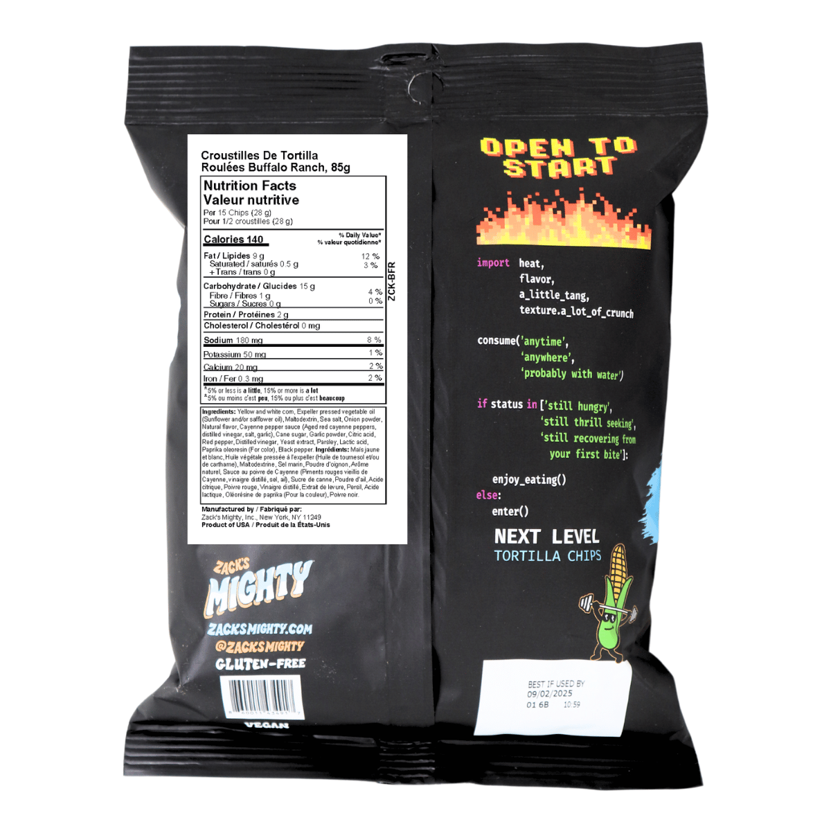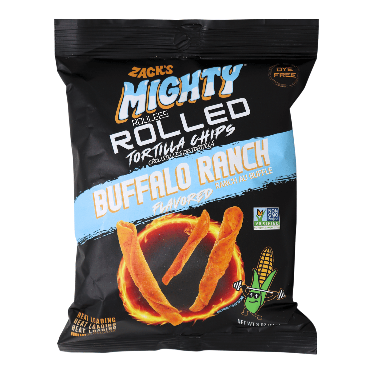 Zack’s Mighty Buffalo Ranch Rolled Tortilla Chips combine the bold heat of classic buffalo sauce with the tangy, creamy taste of ranch seasoning, all wrapped up in a dairy-free buffalo ranch tortilla chip. Crunchy, creamy, and most of all, spicy!