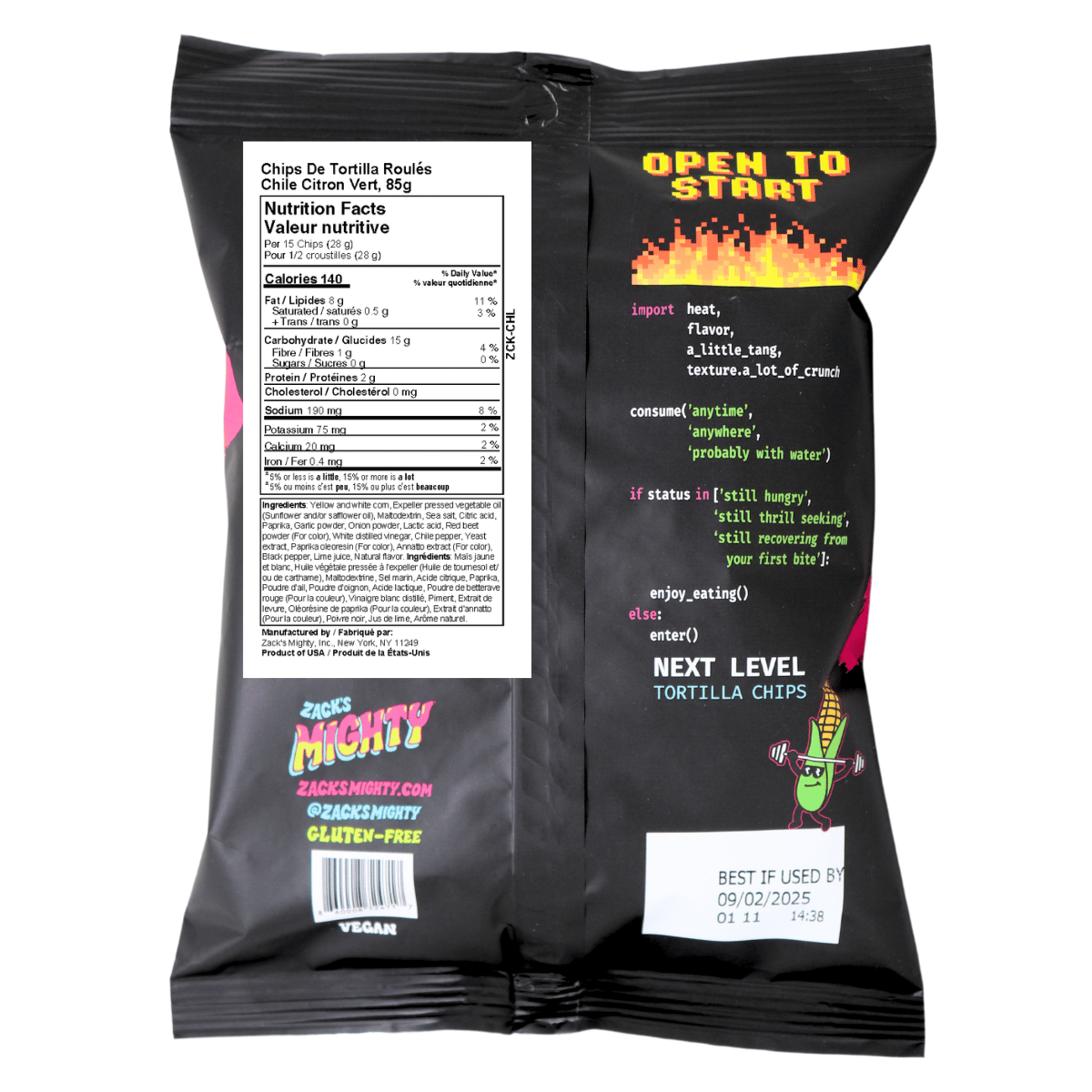 Get ready to blast off into a different flavour dimension! Zack’s Mighty Chile Lime Rolled Tortilla Chips are your new flavour vessel. Vegan, gluten-free, non-GMO rolled corn chips made to pack a punch.