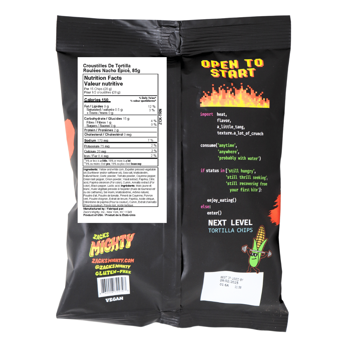 Well, do we have news for you. Turn up the heat with Zack’s Mighty Fiery Nacho Rolled Tortilla Chips; a cheesy, spicy, dairy-free take on gluten-free nacho cheese tortilla chips