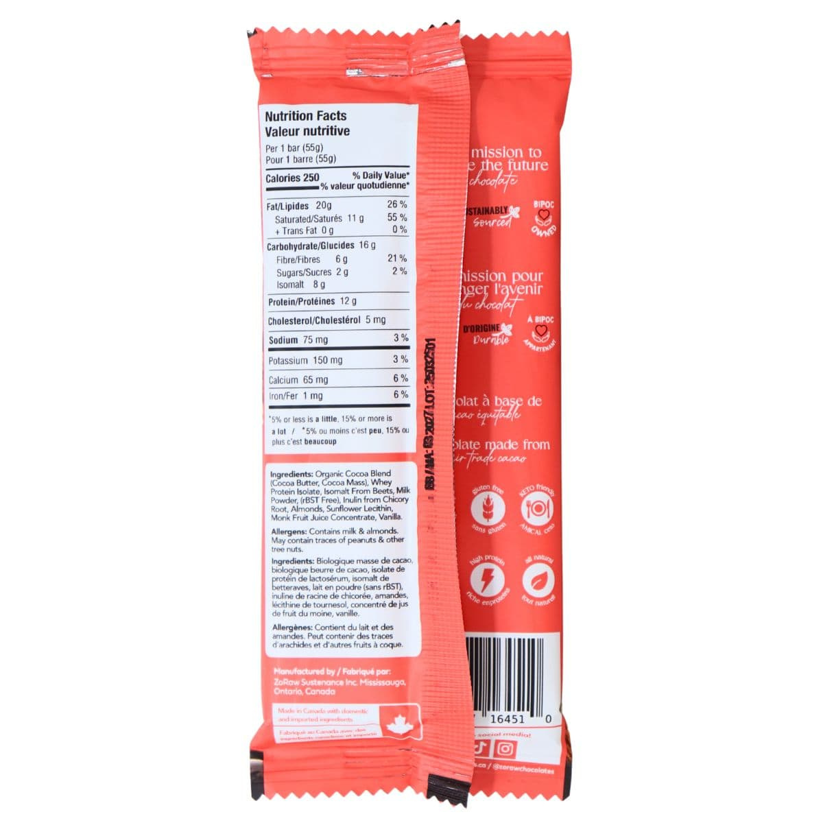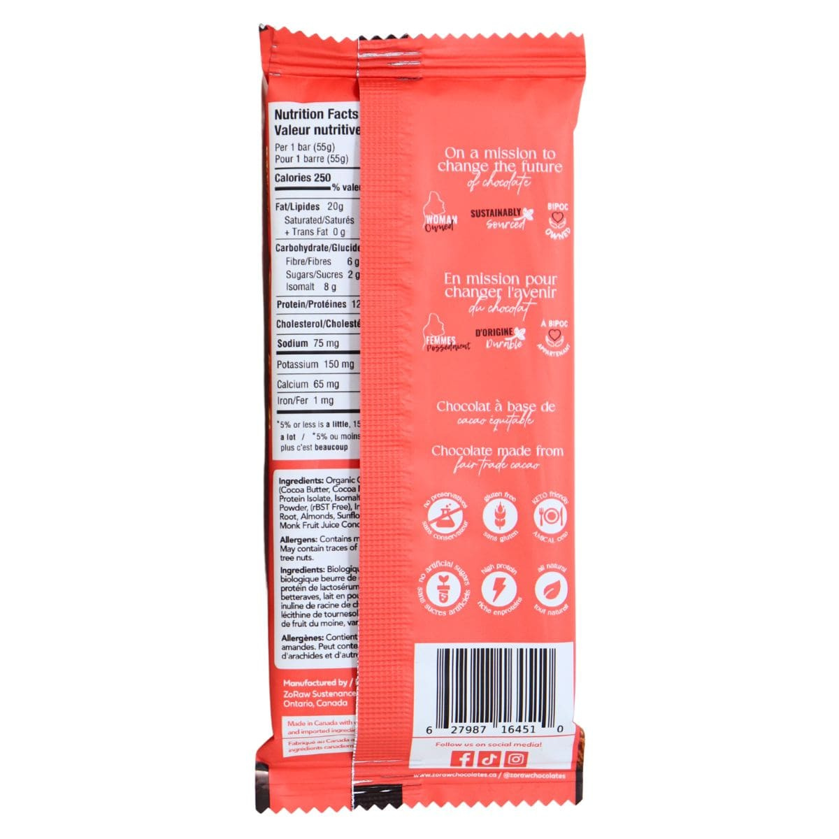 A chocolate bar that tastes good, and is good for you? Yes, please! Brace yourself for a velvety smooth almond milk chocolate bar that's so sinfully delicious, it’s almost too good to be true. ZoRaw’s keto high-protein chocolate bar combines premium cacao butter and cocoa mass and transformed it into a sinfully delicious milk chocolate bar that’s sprinkled with crunchy almonds for a true chocolate masterpiece! With 12g of protein, 6g of fibre, and only 2 net carbs, ZoRaw has waved their magic wand and transformed a guilty pleasure into pure bliss, so you no longer have to resist the temptation. Low carb and low sugar, it's time to savour the best of both worlds—decadent flavour and nourishing goodness with this ZoRaw’s healthy chocolate bar!